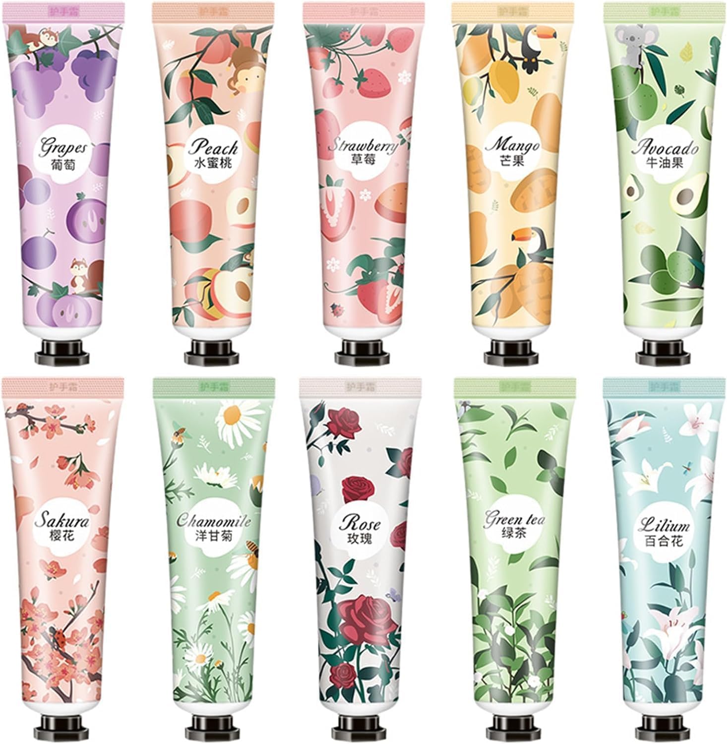【10 Pack Natural Hand Cream Gift Set】Contains grapes, peaches, mango, strawberries, avocado, cherry blossoms, chamomile, roses, green tea, lily. 10 kinds of hand cream with different fragrance can meet your needs at different times. You can also share with your family and friends the scent they like.