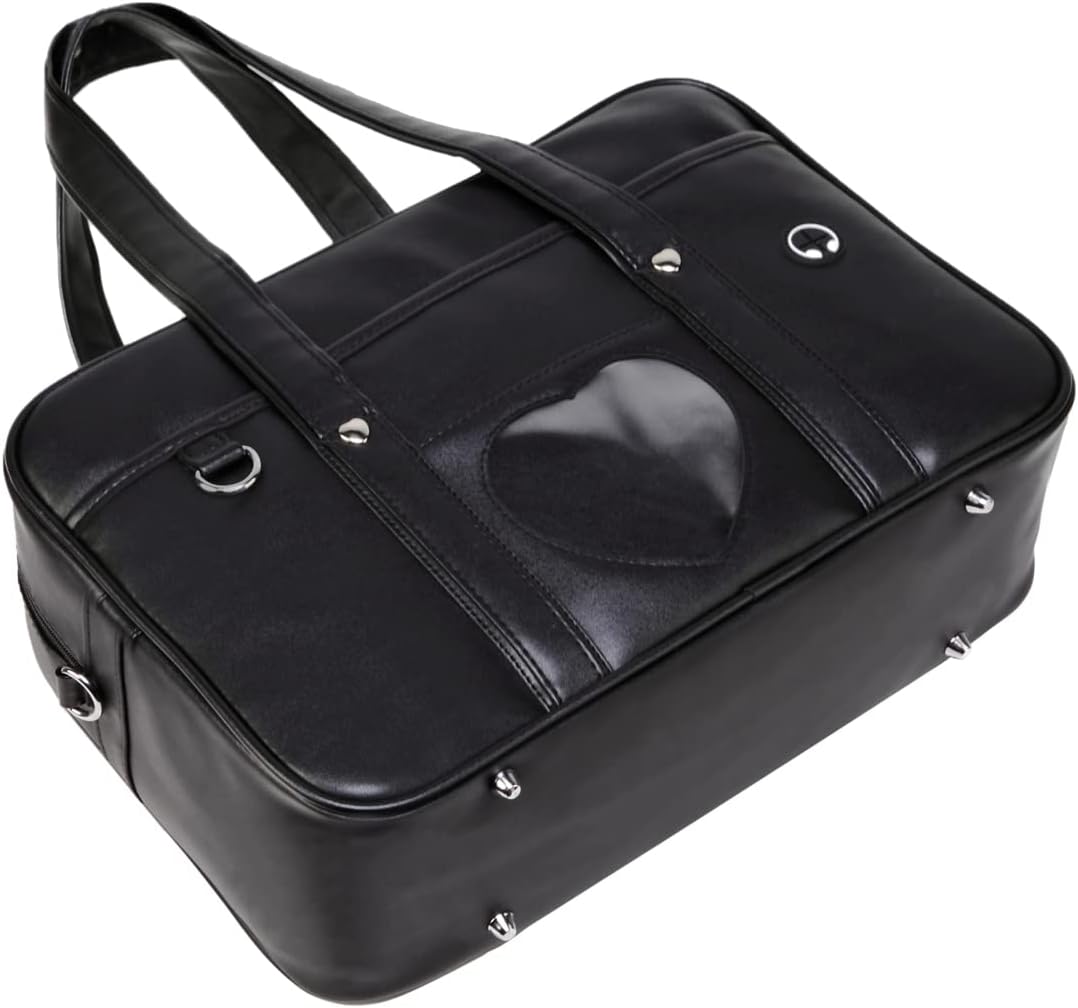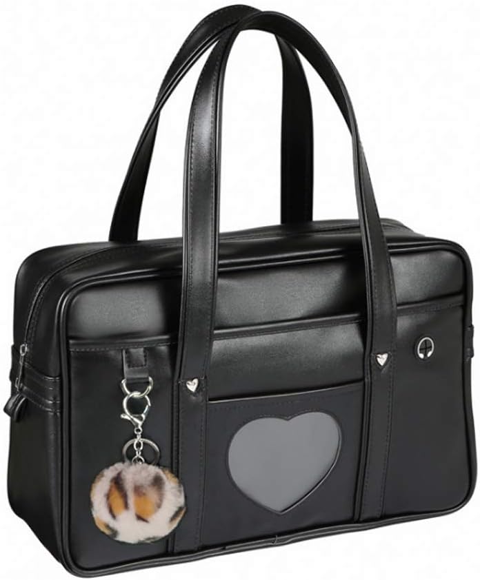 Chillpaper Large Japanese Shoulder Bag,Faux Leather Tote Bag Kawaii with Pink Leopard Pompom (A3 Big Size, Black Heart Window), Black, A3 Big Size