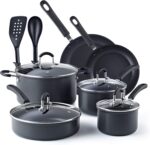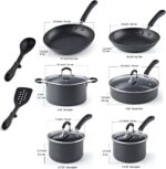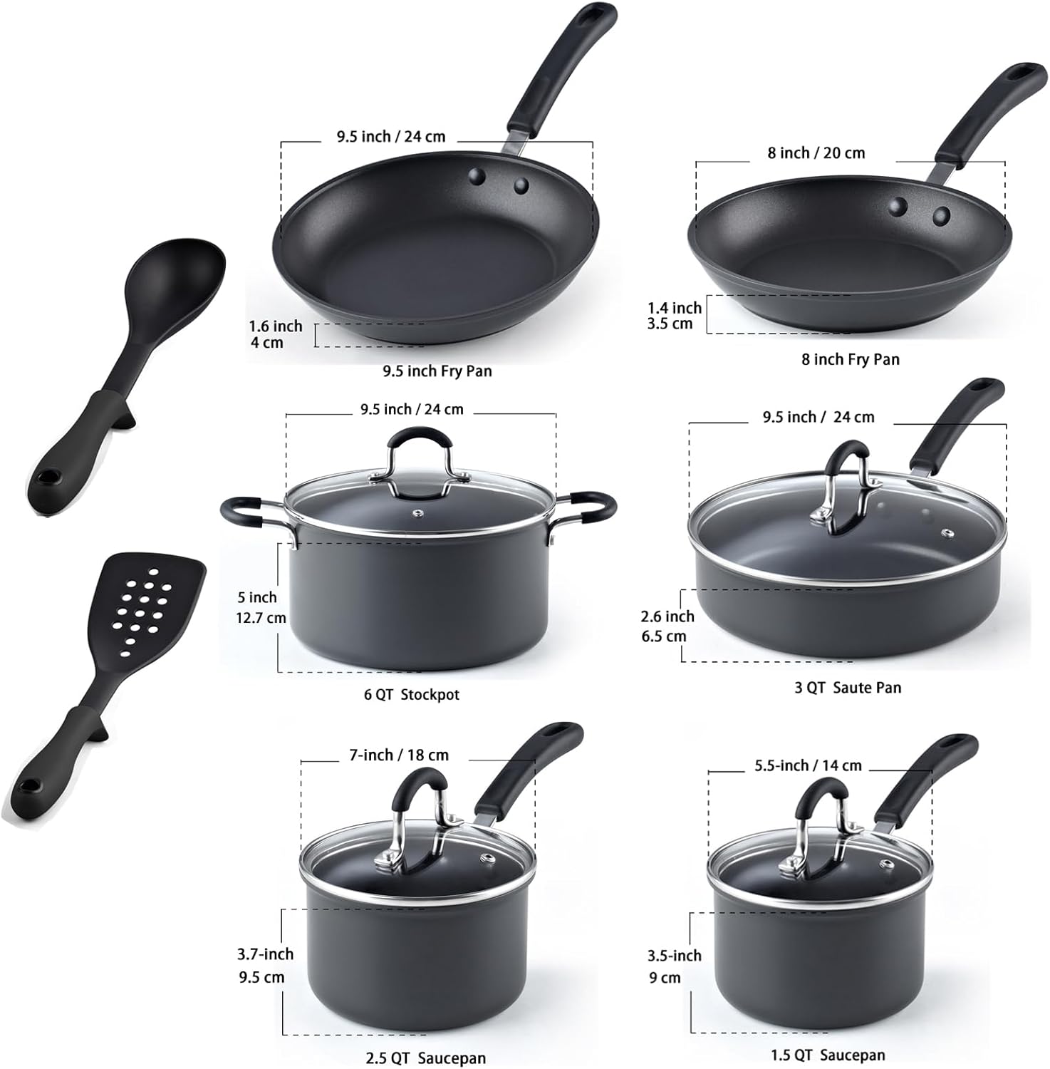 Nonstick Cookware Set: The 12 piece nonstick pots and pans set includes 1.5 and 2.5 quart saucepans with lids, 6 quart stockpot with lid, 3 quart sauté pan with lid, 8 and 9.5 inch frying pans, a nylon spatula, and a spoon
