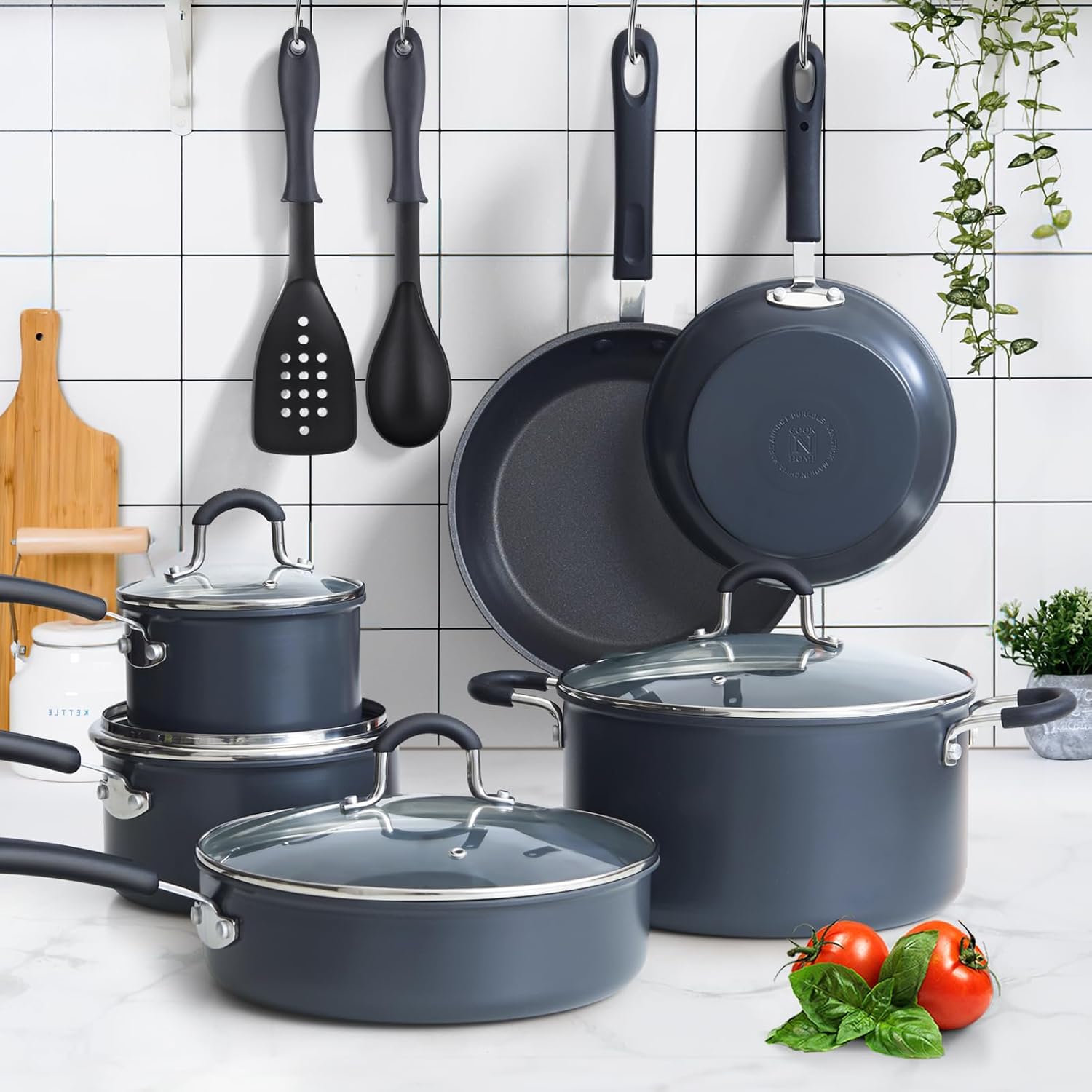The Cook N Home 12Piece nonstick hard anodized cookware set, Black includes: 1. 5 and 2. 5 quart Saucepans, 6 quart Stockpot, 3 quart/9. 5-Inch deep sauté pan with lids, 8 and 9. 5-Inch fry pans, and a nylon spatula and spoon. Cookware has a hard anodized surface that is durable, heats evenly/quickly, and prevents hot spots. Material is harder than steel, thick, and chip-resistant. Nonstick delivers exceptional performance, makes cleaning/food release easy, and allows for healthy cooking. Tempered glass lids with steam vent makes viewing food easy, keeps heat/moisture in. Riveted comfortable handles with wide grip Stay cool while cooking and has a hole for hanging. Utensils with guard are sturdy for mixing, moving, and transferring foods. Not induction compatible. Works on gas, electric, glass, ceramic, halogen, etc. Oven safe to 350F. Dishwasher safe, hand wash recommended.