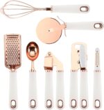 Outfit a new kitchen or update your existing collection with this must have trendy and deluxe, COOK with COLOR copper kitchen gadget utensil set that will add a unified modern look to your kitchen decor. Set includes 1 can opener (8.5â long), 1 ice cream scopper (8.5â long), 1 peeler (8.5â long), 1 pizza cutter (8.5â long), 1 garlic press (8.5â long), 1 cheese grater (10â long) and 1 whisk (12â long). Copper plated stainless steel gadgets with comfortable, soft touch, good grip, non-slip handles that absorb pressure and make it easier on your hands. Arrives neatly packaged in a box â the ultimate gift idea. Perfect for bridal showers, housewarming gifts and all other occasions. Hand wash with warm soapy water.