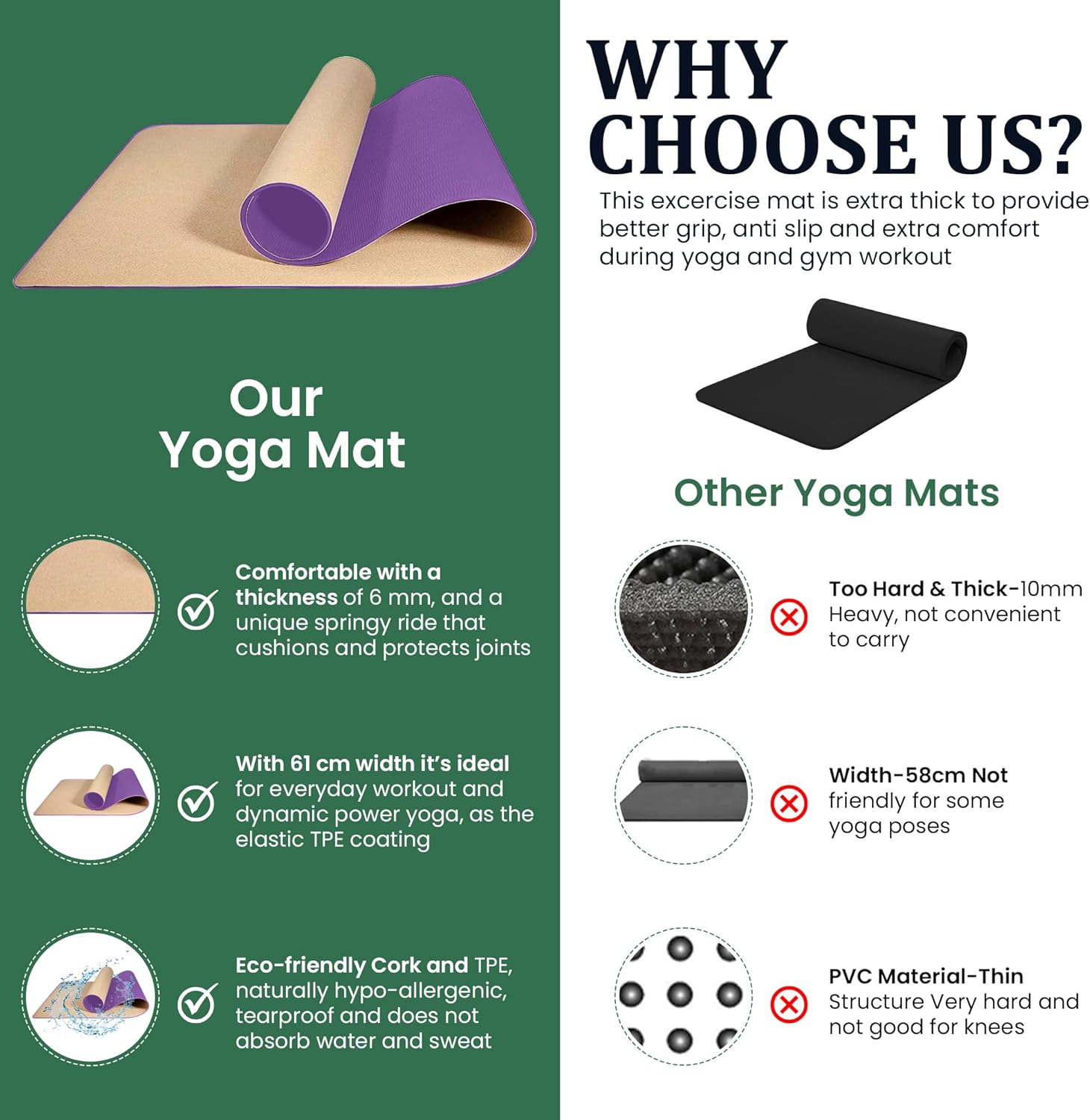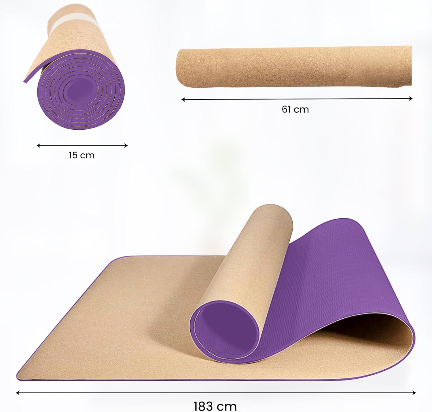 Cork & Rubber Yoga Mat – a combination of that meets and exceeds your expectations Eco-friendly & Sustainabe – high-quality, eco-friendly and nontoxic, waterproof, non-slip mat Comfortable & Practical – With our 6mm thickness, protective layer, double-sided non-slip surfaces you can perform any movement with confidence and enjoy your fitness sessions without knee pain Easy To Go & Store – Lightweight (1KG) and perfect size (183*61cm – 6mm) It’s just perfect for everyday workout