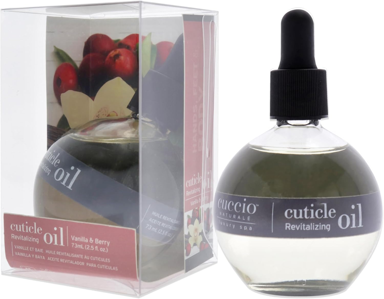 Vanilla contains antioxidant properties, while Cranberry soothes and hydrates. Conditions and helps nourish the cuticles. Naturally soothes and moisturizes for stronger, healthier nails Contains Safflower Oil and Vitamin E Apply one drop of Cuticle Revitaliser to each cuticle and massage gently- can be used daily Cuccio Naturalé Revitalizing Cuticle Oil is made from high quality natural cold pressed oils. The lightweight oils contain high levels of moisturizing properties without leaving excess oiliness on the skin. Dryness can cause the skin to become jagged and torn. The Revitalizing Cuticle oil is your first defense to keep the cuticle area in pristine condition. The Revitalizing Cuticle Oil can also be used on the body with amazing results. It is all around an impeccable oil to keep your skin moisturized, soft and luscious. KEY INGREDIENTS AND BENEFITS Safflower Oil: provides exceptional lightweight hydration with Omega 6 EFAs, antioxidant properties of beta-carotene and vitamin E Vitamin E: lightweight hydration and antioxidant properties • Lightweight super-penetrating oil with enticing fresh scents to nourishes, moisturizes and care for cuticles and nails. • Created from high quality natural cold pressed oils and vitamins to provide intense moisturize without leaving excess oil and can used on the body. • Professional tilt bottle for easy use. • No harmful ingredients, cruelty free, paraben free and plant derived.