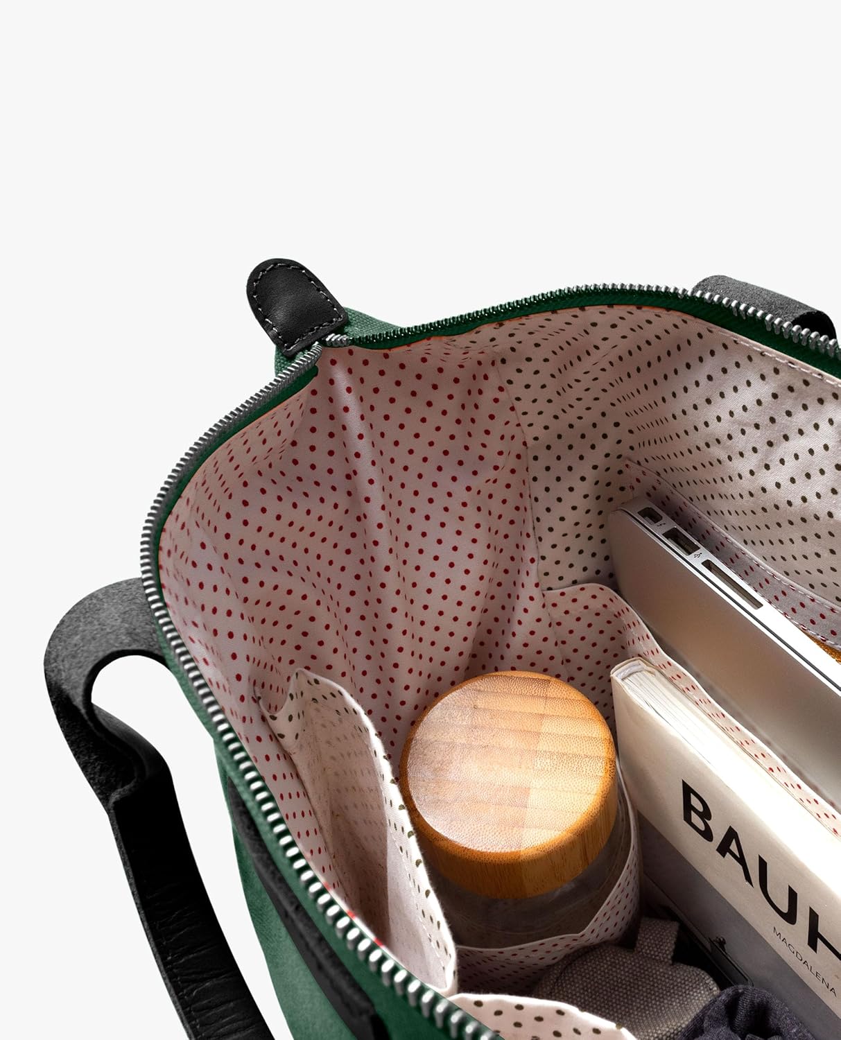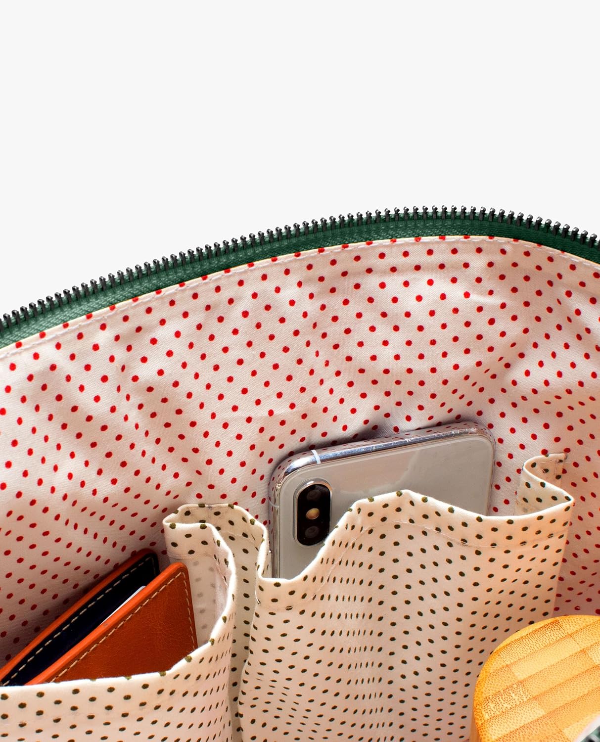 Wholly cotton inner lining with select prints. Internal zip pocket and two slip pockets for small storage. External back pocket with full length slide facet. Classic leather branding. Metal zippers with seamless leather pull and snap hook keychain holder.