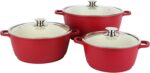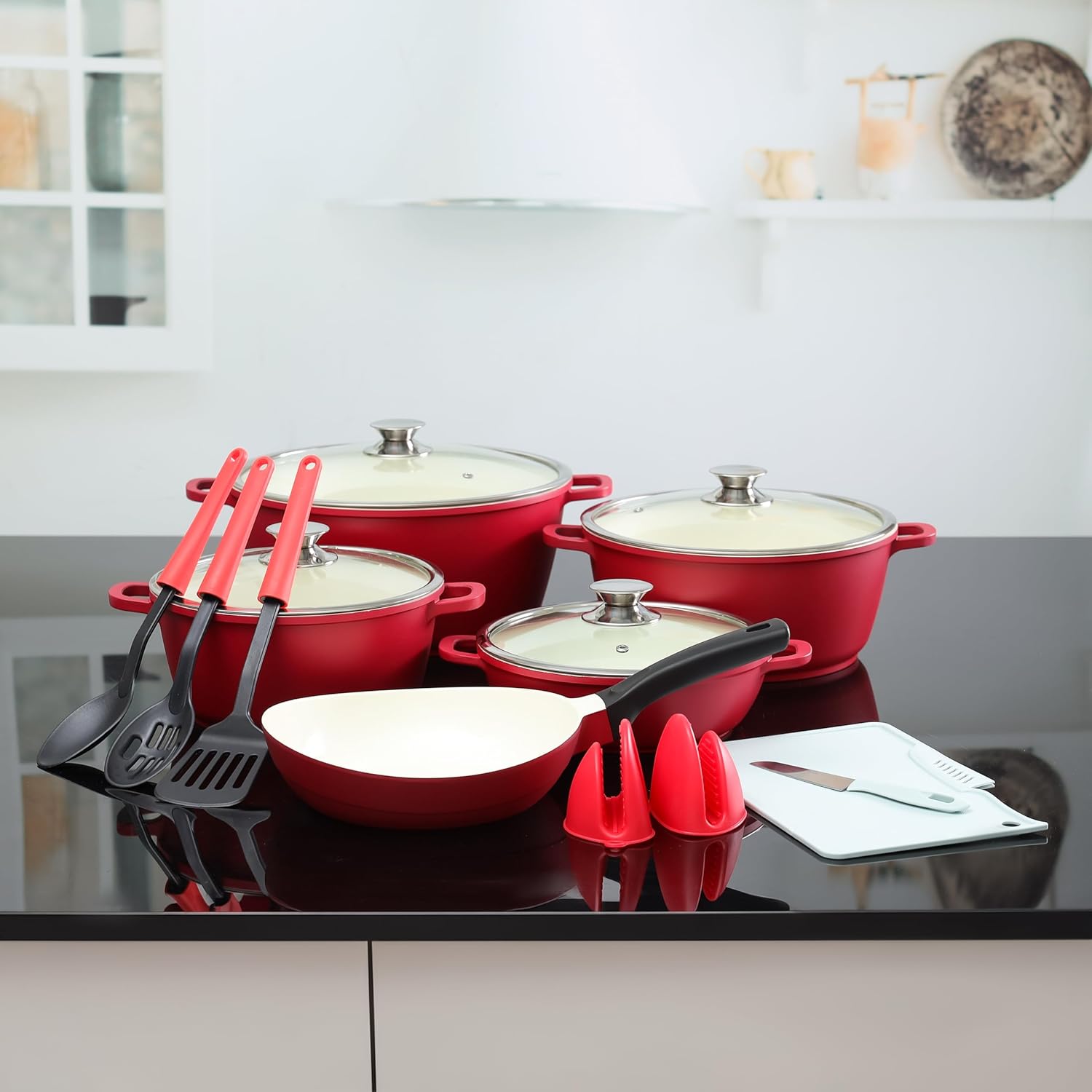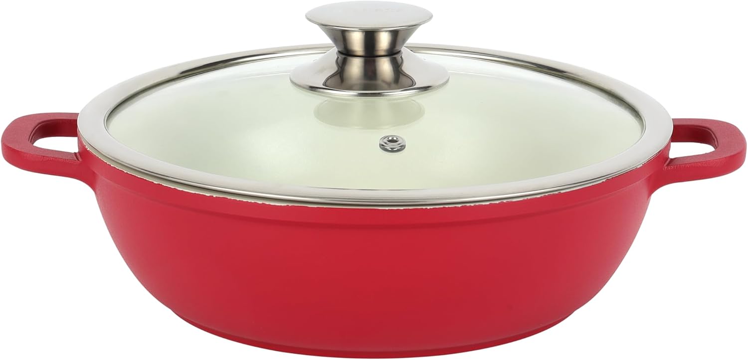 Delcasa DC3436 Non Stick Ceramic Coated Cookware Set is your complete cooking companion. Experience even cooking and easy cleanup with the 16-piece non-stick ceramic-coated cookware set with a diecast aluminum body. The set includes a 32×15 cm casserole and lid, a 28×12.5 cm casserole and lid, a 24×7.5 cm shallow pan and lid, a 24×11.5 cm casserole and lid, a 24×6.5 cm frypan, a knife and cutting board, 3 nylon tools and 2 silicone handle holders. With a stylish red exterior, an aluminum body and a durable 5-layer nonstick interior, this cookware is appropriate for happy homes. The cookware set is PFOA-free and PTFE-free, making it safe for everyday use. High thermal resistance and durability enable years of healthy and fast cooking. The flat CD bottom ensures even heat distribution and fast cooking. Featuring a stylish red color, a modern design and long-lasting durability, the set makes a thoughtful gift. Inspire the inner chef in you, get that apron on with this stylish beginner cookware set and prepare healthy and delicious meals at home. Bakelite handles and a tempered glass lid. This 16-piece cookware set has strong, soft, heat-resistant bakelite handles that ensure safety, making it easy for beginners. Casseroles and saucepans have transparent lids made of tempered glass with a steel frame. These lids allow easy monitoring of the contents and process and ensure moisture retention. Suitable for all cooking surfaces. The cookware set has a CD base and is compatible with other stoves such as gas, ceramic, halogen and hot plate cooktops.