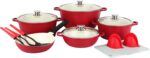 A 16-piece nonstick cookware set with casseroles and pans that features a strong, durable diecast aluminum body and a 5-layer non-stick ceramic coating.