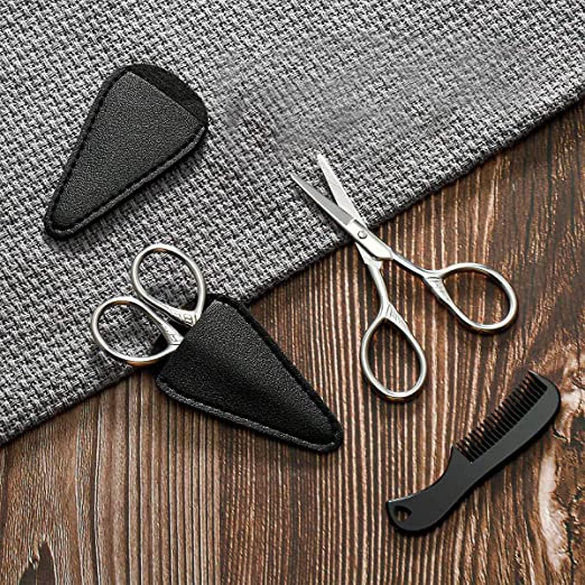 Beauty grooming kit: 5 in 1, you will receive 2 grooming scissors, 1 eyebrow tweezers, 1 small comb, and 2 PU sheaths; After trimming your hair, you can use tweezers and small comb to make you look cleaner and neater.