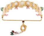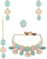 This Jewellery Set Consists Of A Necklace, A Pair Of Earrings, A Maang Tikka And A Finger Ring|Gold-Plated Choker Necklace Has Turquoise Blue, Pink Kundan Stone-Studded And White Beaded Details|Secured With A Drawstring Closure|A Pair Of Matching Drop Earrings, Each Secured With A Post-And-Back Closure|A Matching Maang Tikka, Secured With A Hook Closure|A Matching Finger Ring, Secured With A Slip-On Closure
