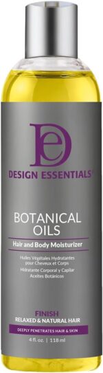 DESIGN ESSENTIALS BOTANICAL OILS HAIR and BODY MOISTURIZER is a synergistic blend of natural oils used to moisturize hair or skin. More info: Conditions and revitalizes dry, dull looking hair Smoothes cuticles while adding a natural shine Lightweight formula often used as an all natural hot oil treatment Silkens, moisturizes and softens hair and skin Ideal for all hair textures May be used on wet or dry hair.