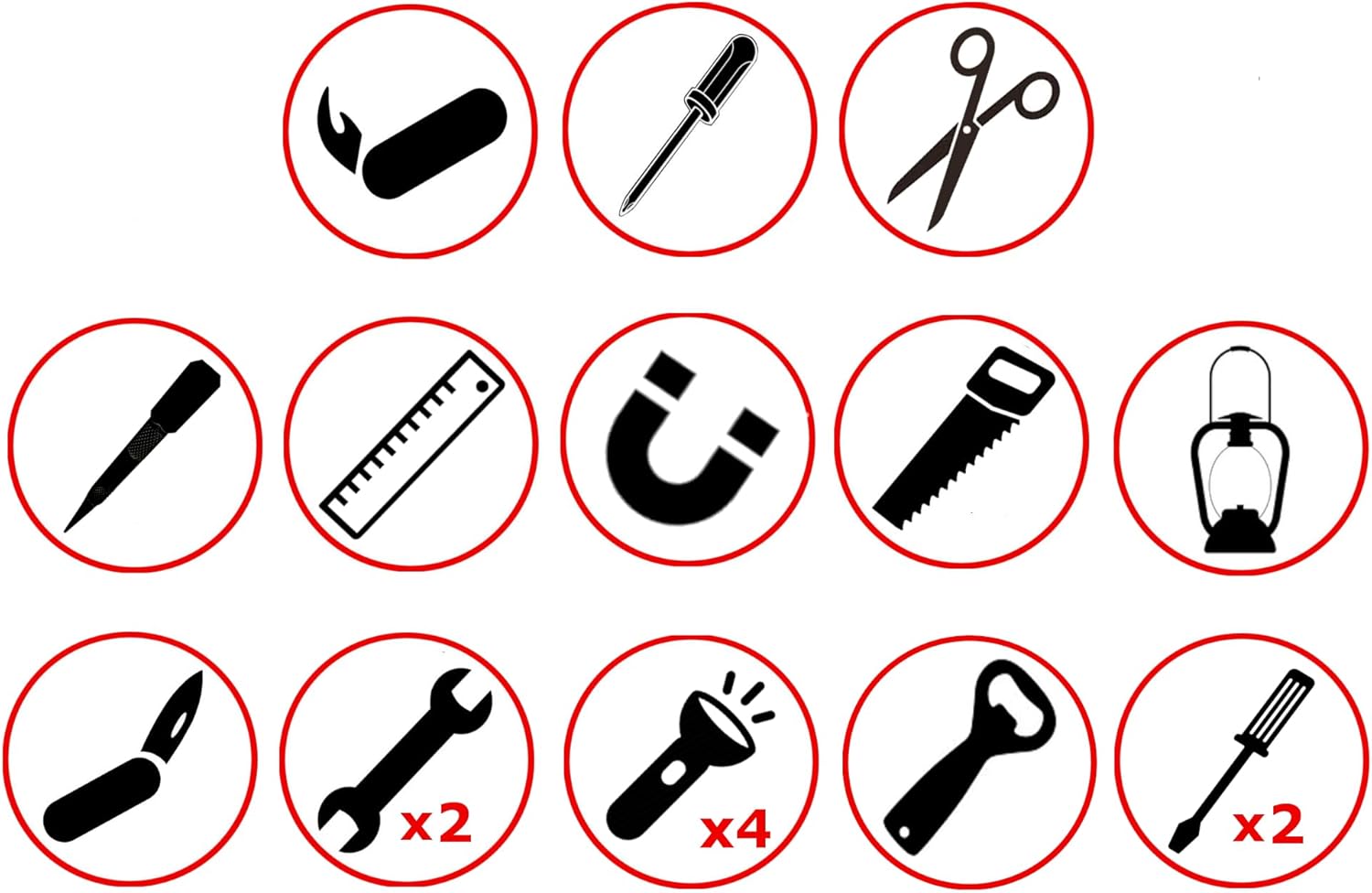 3) THIS 18 IN 1 TORCH MULTI TOOL IS PACKED WITH FUNCTIONS AND DESIGN FEATURES – As well as being a powerful torch, it encompasses two slotted screwdrivers, a Phillips screwdriver, tin opener, bottle opener, scissors, bright lantern, red emergency lantern, alarm, magnetic base, adjustable handle, saw, cutting blade, ruler, hole punch and two wrenches. We’ve also included a FREE 48 IN 1 WALLET MULTI TOOL, a brilliant emergency toolkit!
