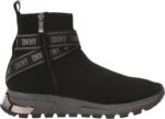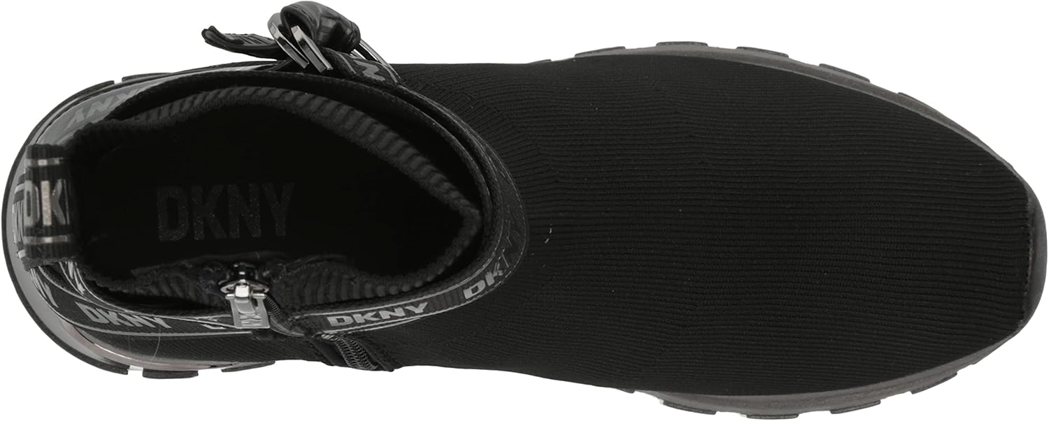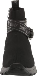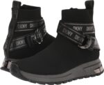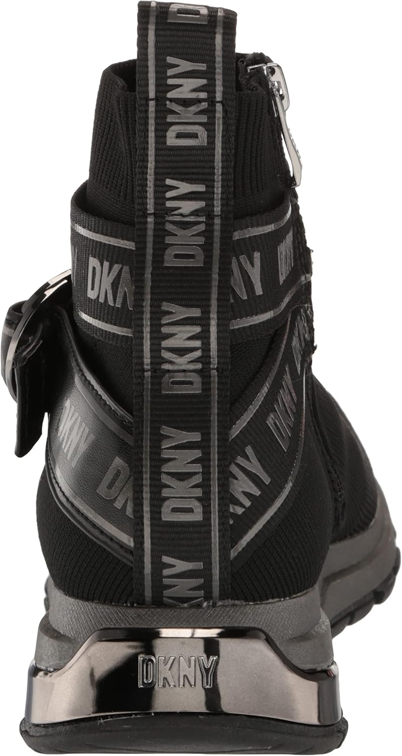 This DKNY womens Miley sneaker is a knit slip-on sneaker with a buckled ankle strap and a pull tab on the heel