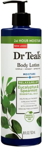 Dr Teal’s Eucalyptus and Spearmint Body Lotion delivers deep moisture to the skin plus rejuvenating aromatherapy. This rich blend of Cocoa Butter, Shea Butter and Vitamin E is infused with uplifting Eucalyptus and Spearmint essential oils to refresh your skin and clear your mind.