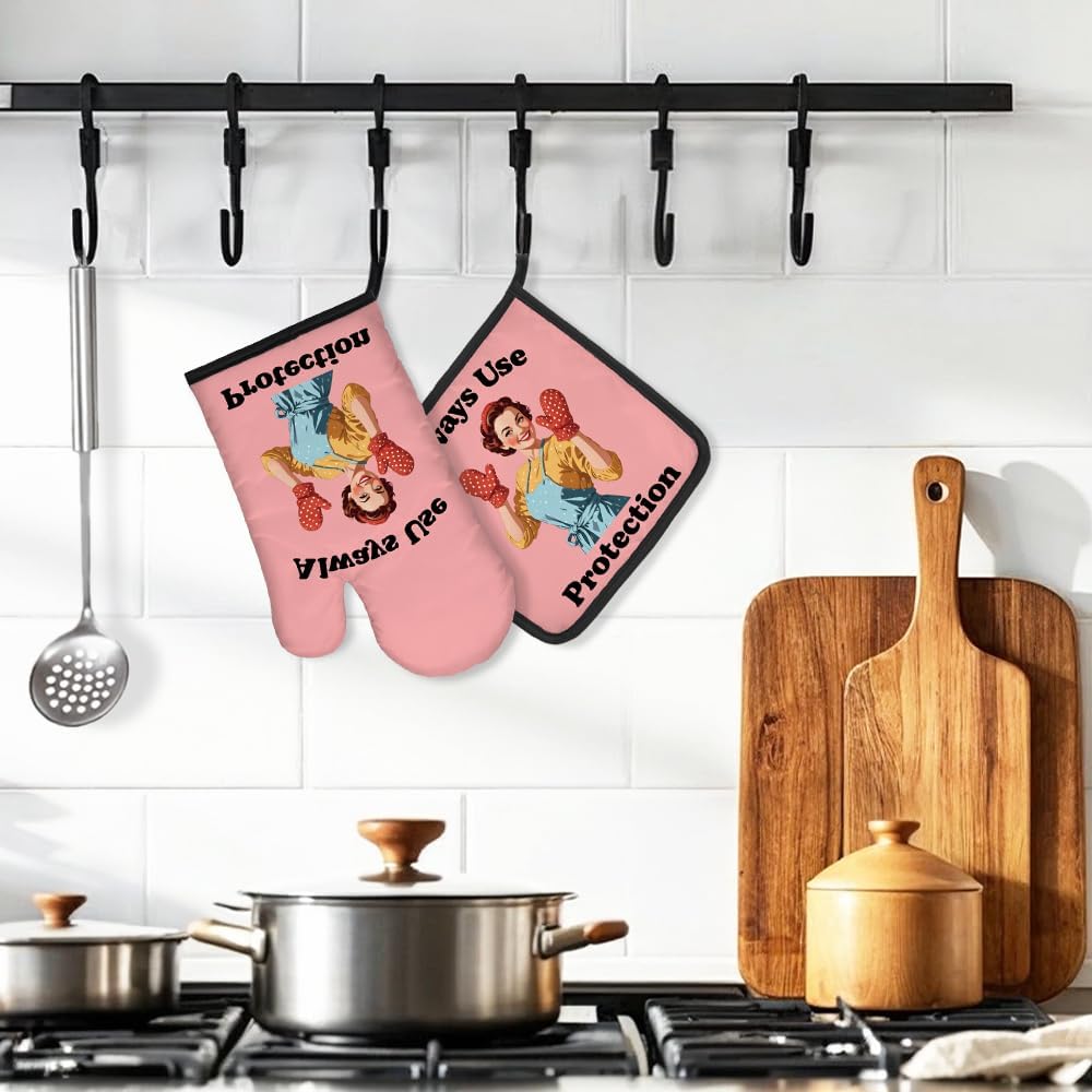 DYJYBMY Always Use Protection Funny Oven Mitts and Pot Holder Set, Retro Housewife Kitchen Gadgets for Women, Baking Gifts for Bake Lover Chef Friend, Hostess Gifts for Mom Wife Aunt Sister BFF