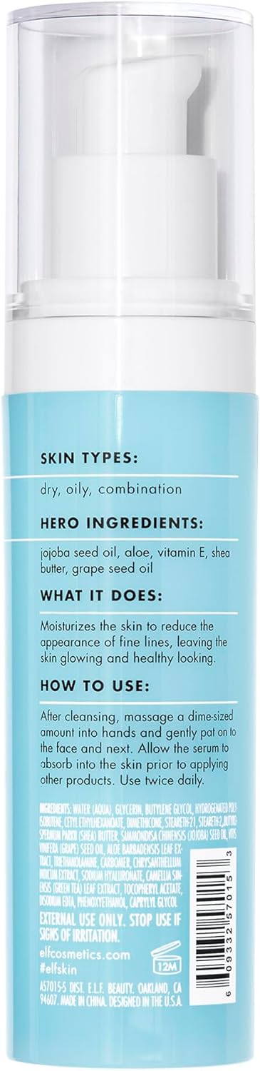 The Hydrating Serum is your secret weapon to a flawless face. With ingredients like purified water, aloe, and green tea, your face looks naturally fresh and glowing. The moisture-rich formula strengthens the skin when used daily. e.l.f. makes the best of beauty accessible to every eye, lip, and face. Your originality is infinite, and we are inspired by what makes you unique. From the early explorer to the trend-obsessed beauty junkie—glam or bare faced, minimalist, maximalist and every look in between—we are for every eye, lip, and face. Proud to be 100% vegan and cruelty-free, worldwide