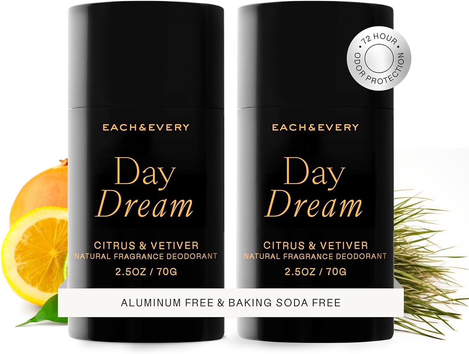 Day Dream – Escape the ordinary with notes of earthy, grounding vetiver and bright, invigorating citrus. Meanwhile, plush tapioca starch and conditioning coconut oil give this sensitive skin deodorant a smooth glide.
