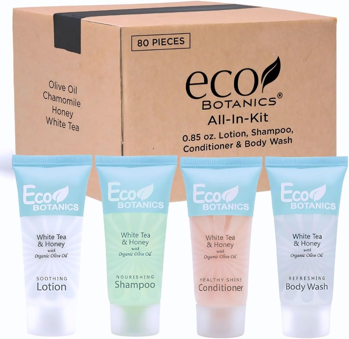 Eco Botanics 0.85 oz. Toiletries Set | 1-Shoppe All-In-Kit Amenities For Hotels, | Hotel Shampoo & Conditioner, Body Wash, Body Lotion | 80 Piece Travel Set