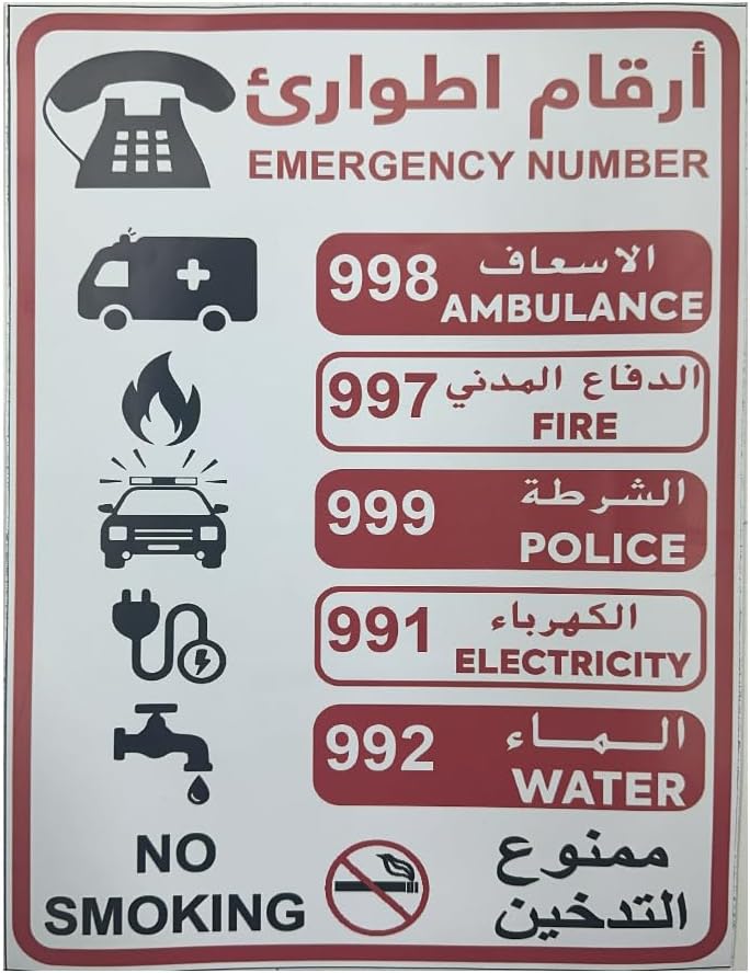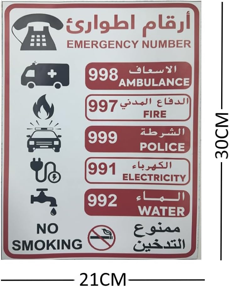 Emergency Number in Dubai Sign Sticker – 21x30cm | Essential Safety Sticker for Homes, Offices & Vehicles