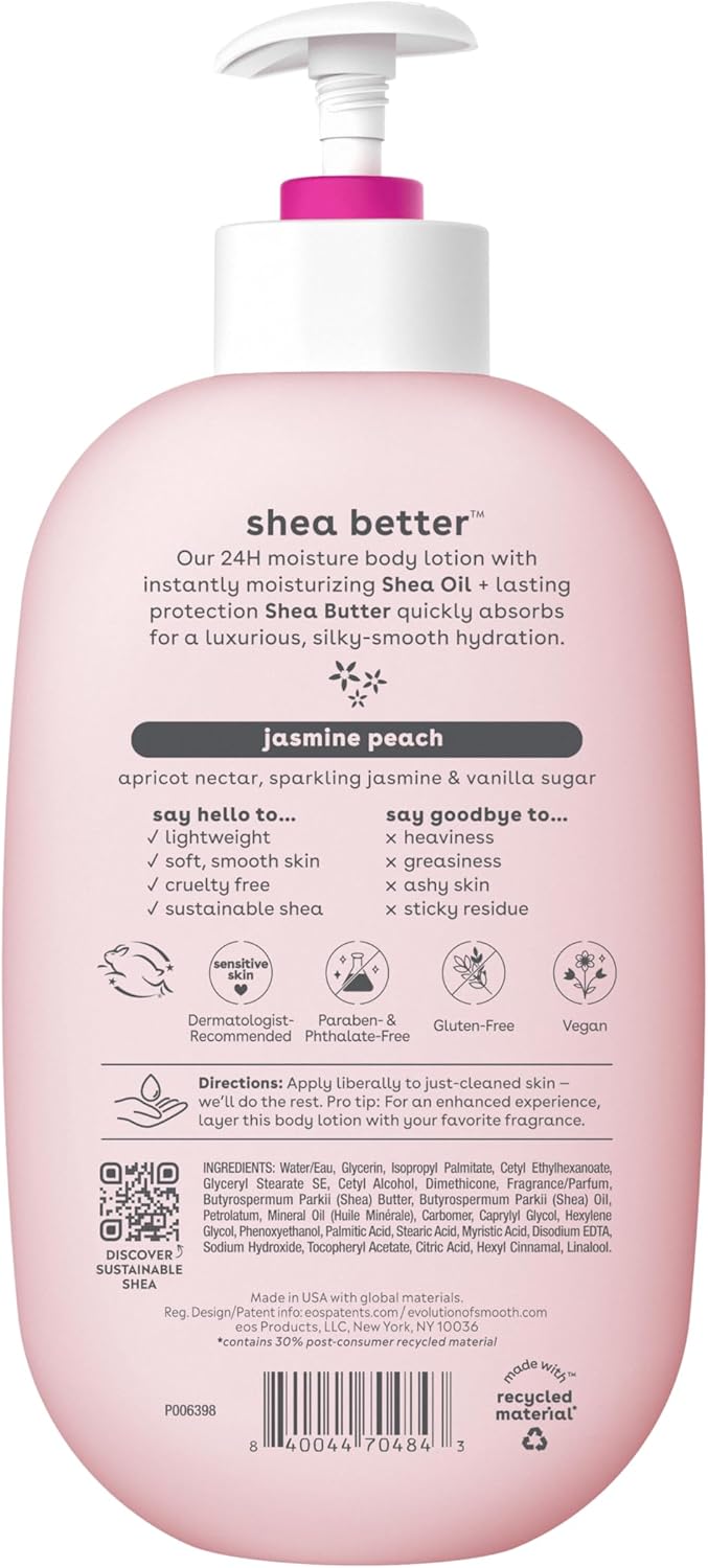 eos Shea Better Body Lotion- Jasmine Peach, 24-Hour Moisture Skin Care, Lightweight & Non-Greasy, Made with Natural Shea, Vegan, 16 fl oz