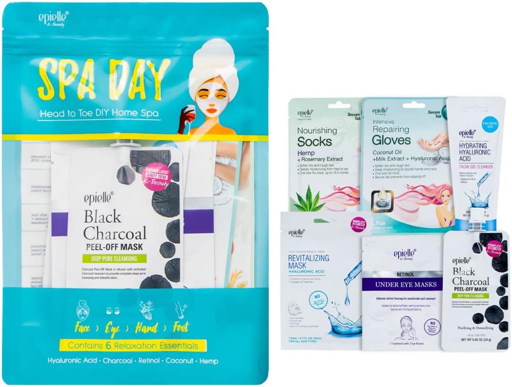 Epielle Clean Getaway Kit contains 6 skincare essential face care items. Clarify, detox, and moisturize all with one bag that you can take with you anywhere.This all in one kit includes sheet mask, self-heating mask, under eye mask, moisturizing gloves, moisturizing socks, and cleansing towelettes. Rediscover your beautiful skin with one single bag that comes with it all. Take your spa day everywhere you go with this travel size friendly bag that has all your spa day necessities.