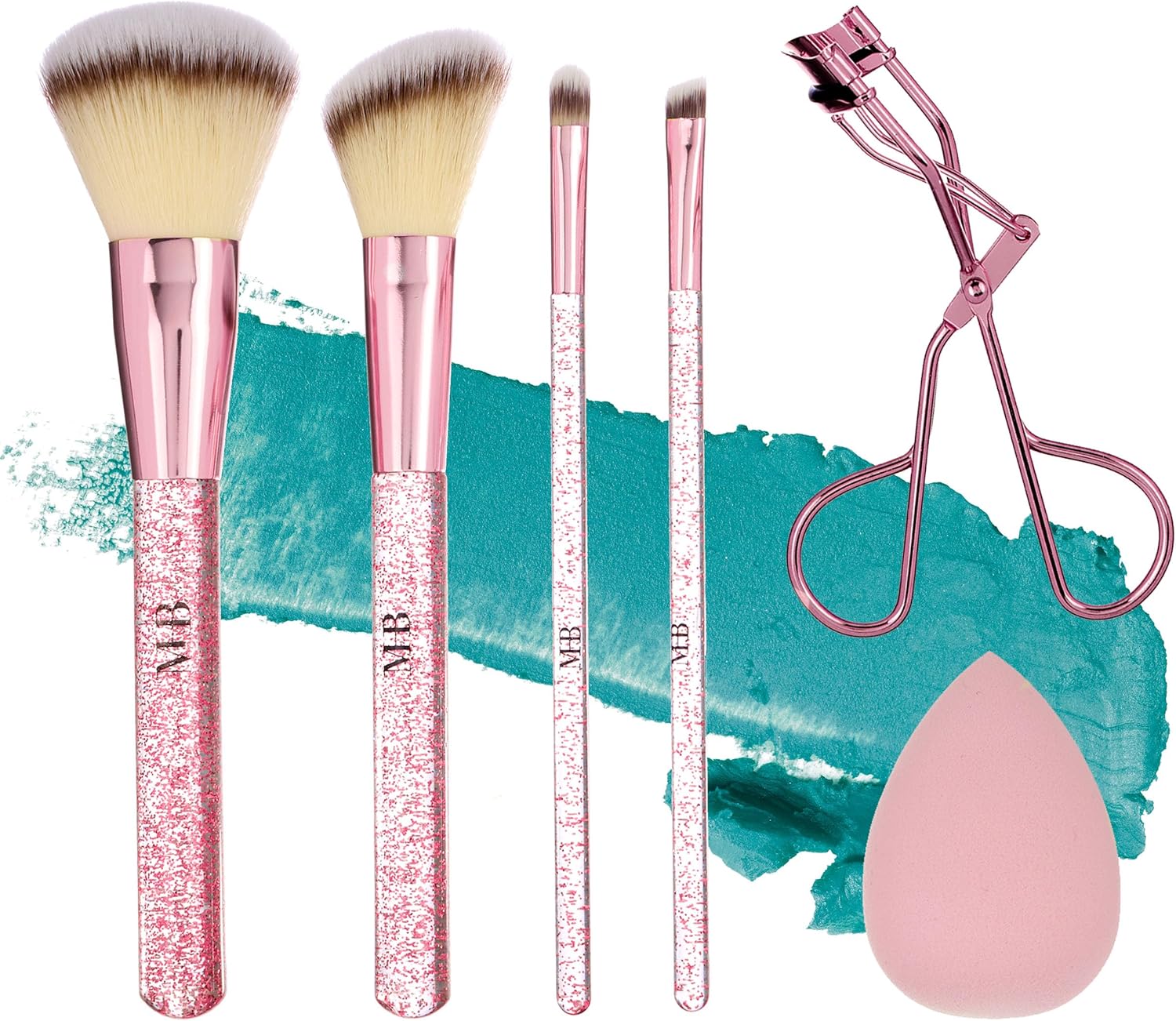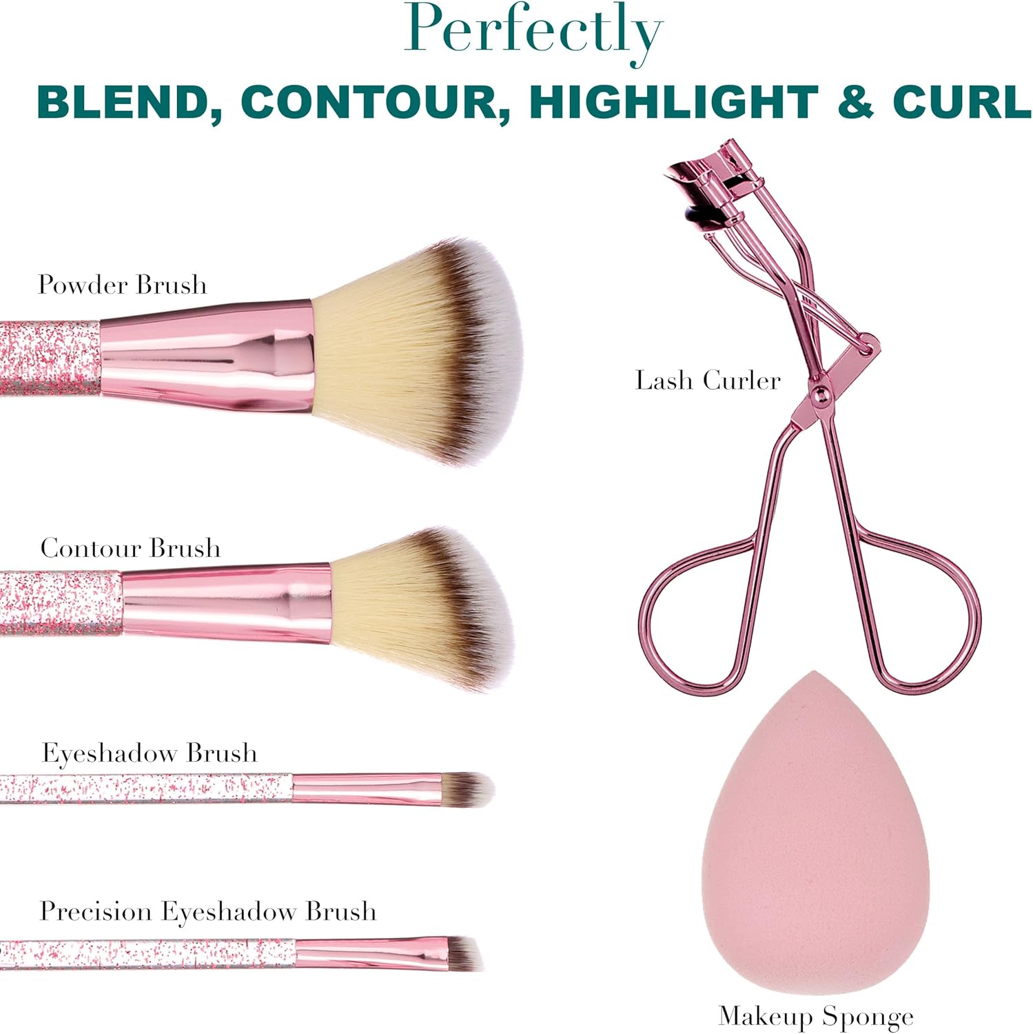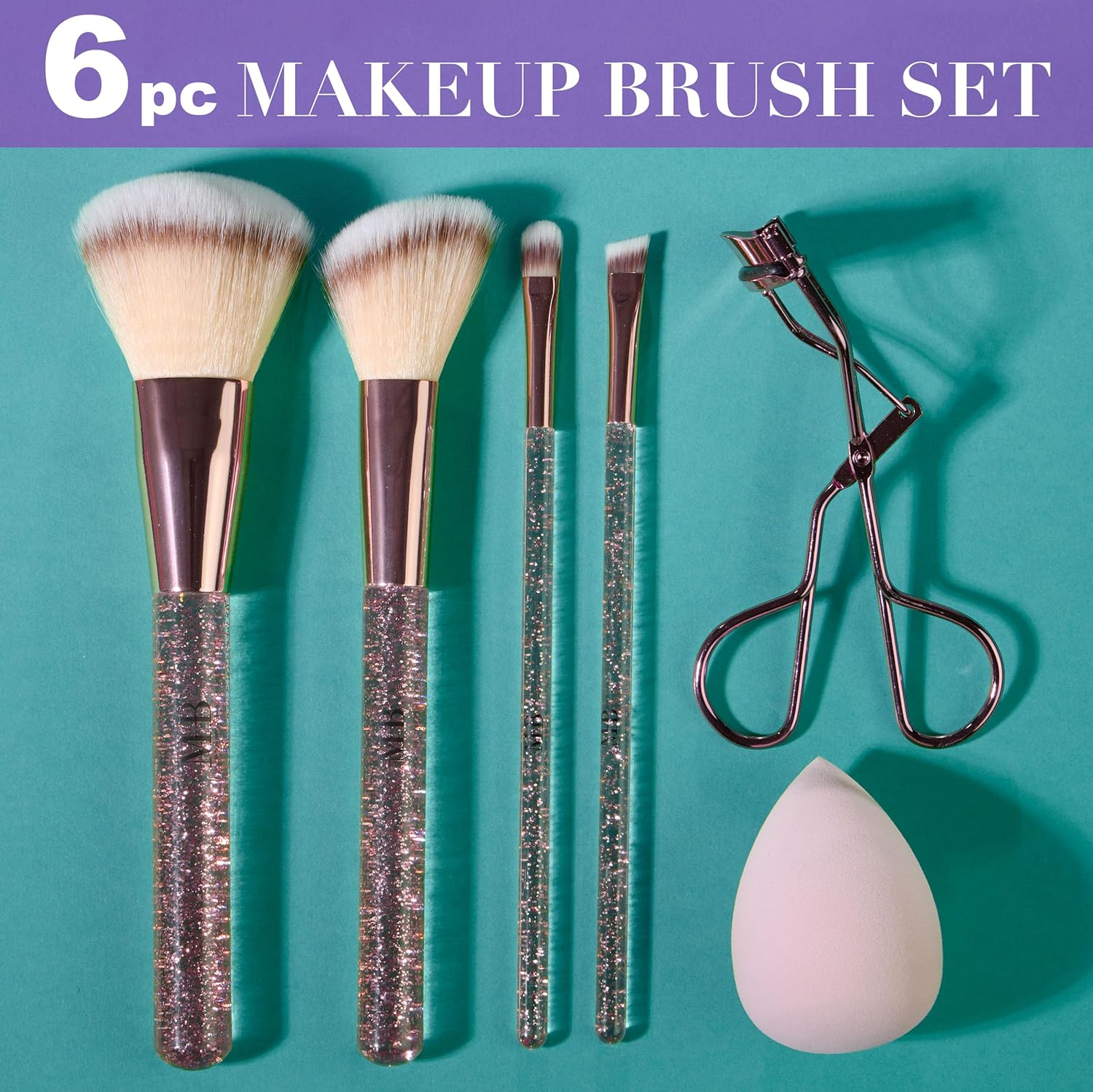 Glitter Makeup Brush Set – Enjoy both style and durability with our makeup brushes; this 6-piece set includes 1 powder brush, 1 contour brush, 1 eyeshadow brush, 1 precision eyeshadow brush, 1 lash curler, and 1 makeup sponge
