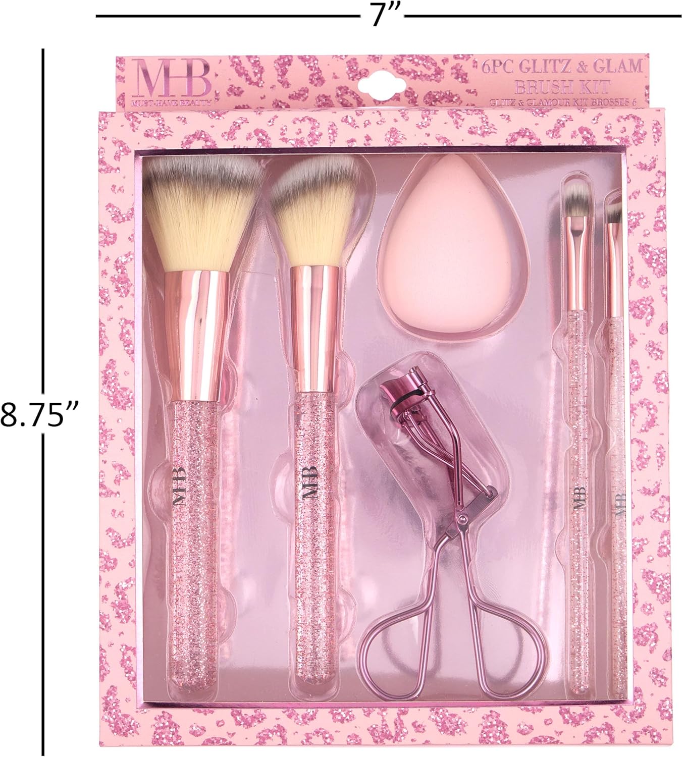 This 6pc Makeup Brush Set includes 1 powder brush, 1 contour brush, 1 eyeshadow brush, 1 precision eyeshadow brush, 1 lash curler, and 1 makeup sponge the brushes feature comfortable and durable glitter handles for a touch of glamour. These brushes boast dense and soft bristles that effortlessly blend, contour, highlight, and curl, catering to a wide range of makeup applications. From precise powder application to flawless eyeshadow blending, this comprehensive set includes all the essential brushes you need for a flawless finish. Complete with a lash curler and makeup sponge, this set is a must-have for any beauty enthusiast seeking professional-quality results.