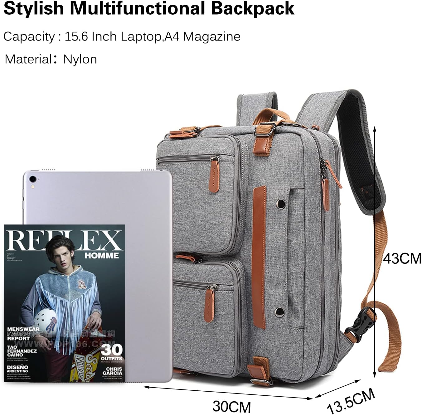 The equipment is supplied with pockets enough to put in your wallet, suit, pens, glasses, Macbook, for most HP/Asus/Acer/Dell/Lenovo inch laptops.