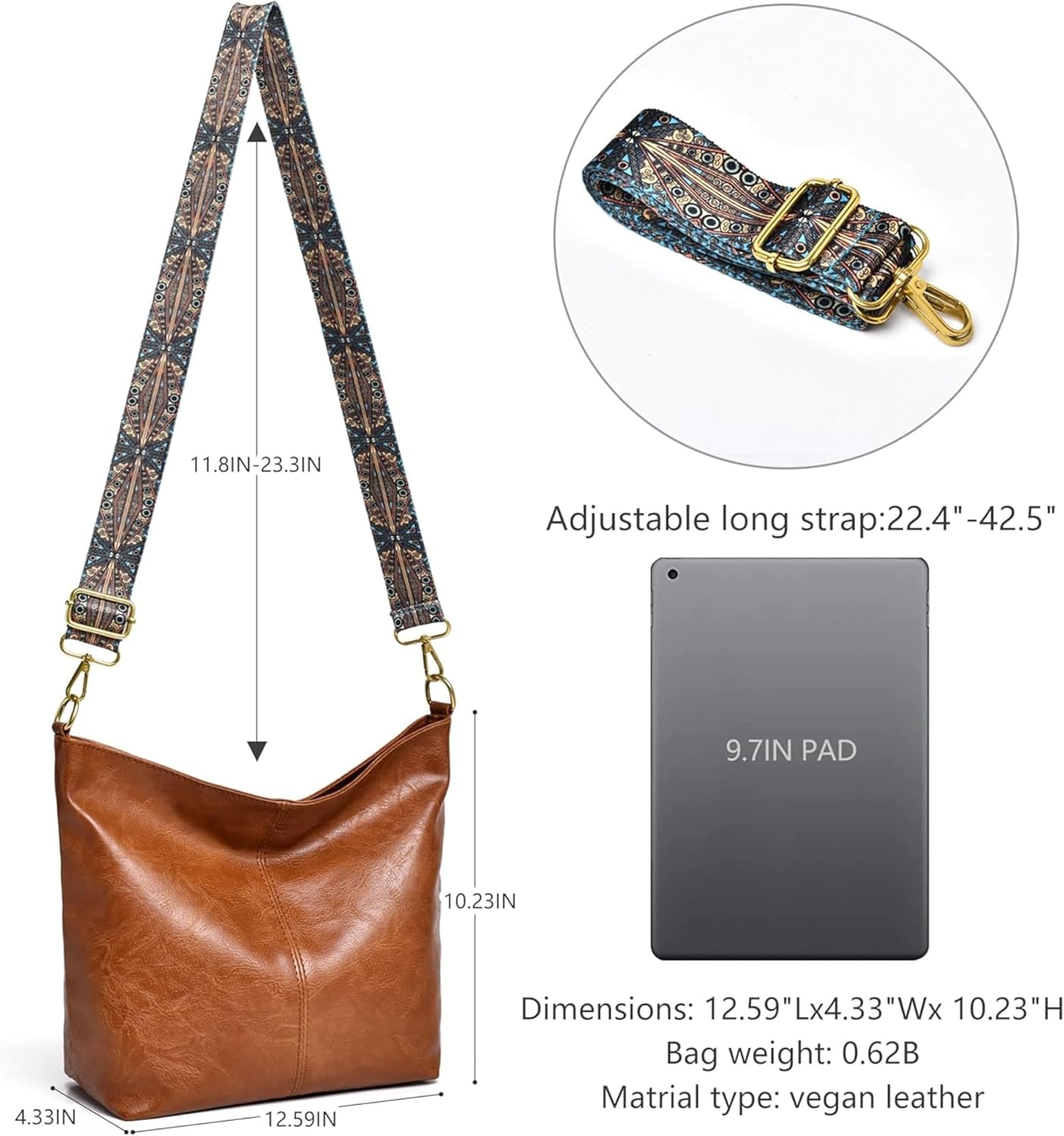 Elevate your daily style with this Fashionable Boho Crossbody Bag crafted from premium vegan leather for a cruelty-free, durable choice. The adjustable wide geometric strap ensures ergonomic comfort, reducing shoulder strain while adding unique flair. With a spacious interior (~12”x10”x5”) and multiple compartments, it effortlessly stores tablets, wallets, cosmetics, and essentials, keeping you organized whether at work, traveling, or out on errands. The secure zipper and snap closures protect your belongings, while the bag’s vintage-inspired design with intricate patterns adds a boho chic touch to any outfit. Lightweight and water-resistant, this shoulder purse is perfect for modern women who want a versatile, stylish, and functional handbag for everyday life. Ideal as a thoughtful gift or for personal use, it merges ethical fashion with practicality and flair.