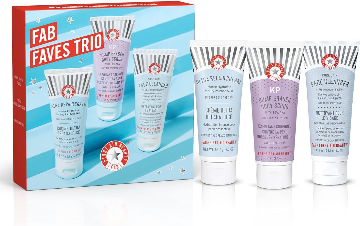 First Aid Beauty FAB Faves Trio – KP Bump Eraser Body Scrub With 10% AHA, Ultra Repair Cream & Pure Skin Face Cleanser (56.7g Each) – 3 FAB Favourites