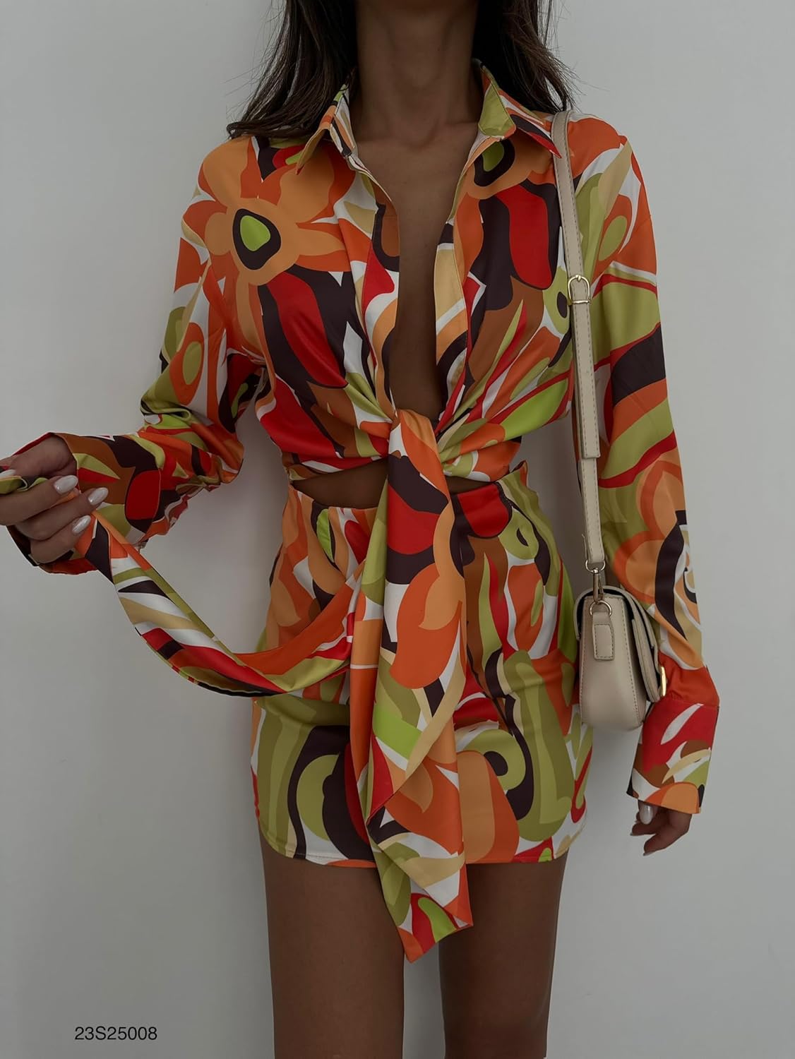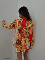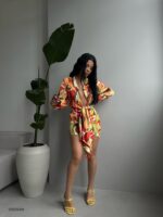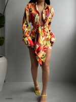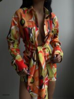 A vibrant and eye-catching abstract floral pattern with a dynamic mix of colors, including orange, red, yellow, green, black, and white. It has long sleeves and a deep V-neckline, accentuated by a tie at the waist, creating a flattering wrap-like effect.