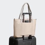 Beyond functionality, the tote excels in practicality tailored for travel. A discreet trolley pass-through on its back allows seamless integration with suitcase handles, ideal for navigating busy terminals with ease. Its sleek, triangular profile slips effortlessly under your arm or down narrow plane aisles, ensuring you move with agility and style.