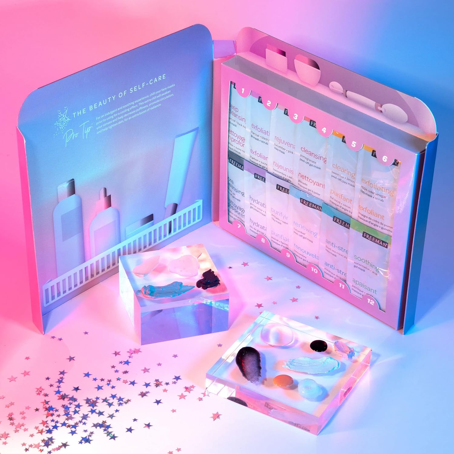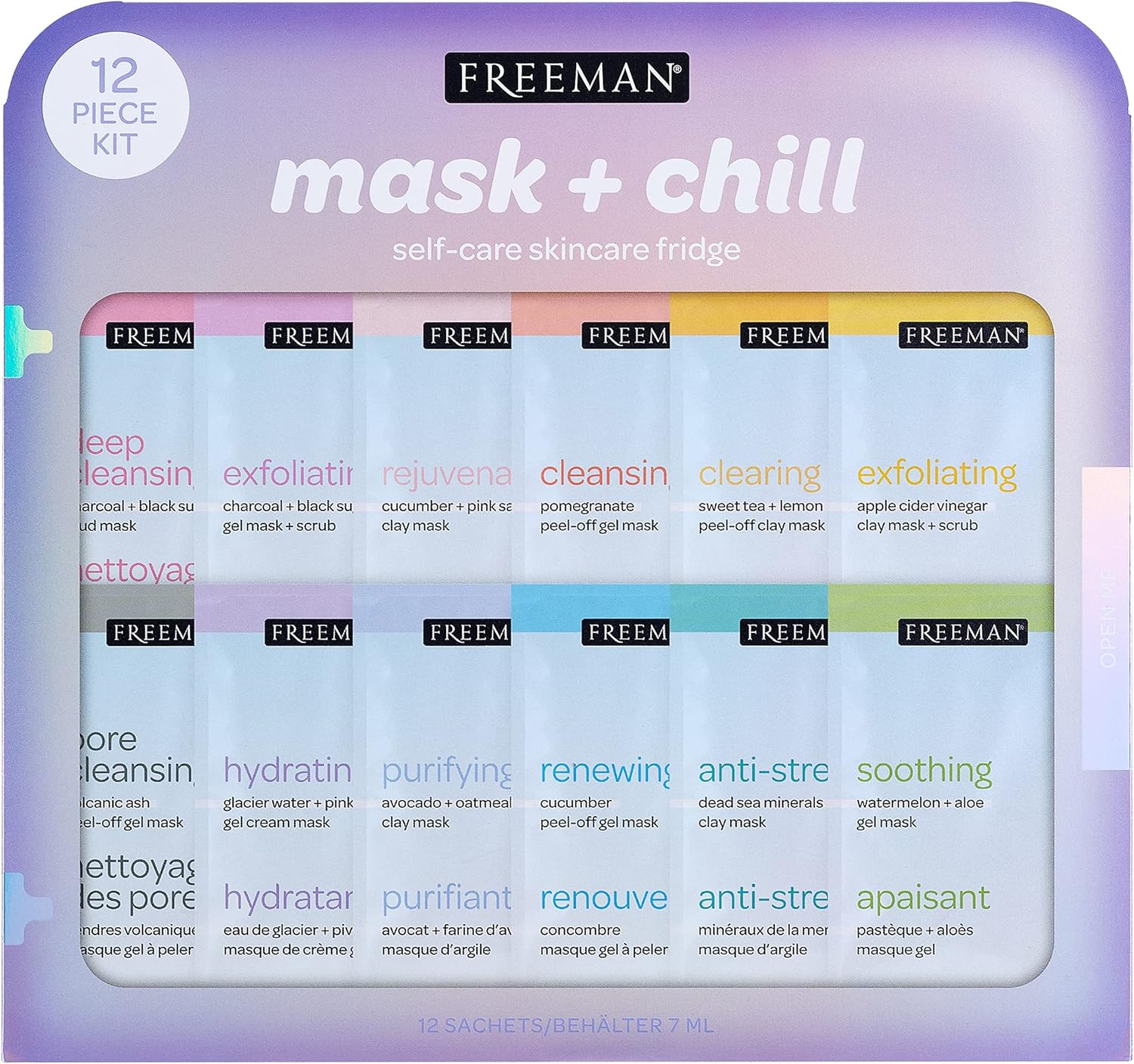 FREEMAN Limited Edition Mask & Chill Self Care Skincare Mask Holiday Kit, Face Masks To Exfoliate, Hydrate, Relieves Stress, and Refines Pores, Facial Mask Variety, 12 Piece Gift Set