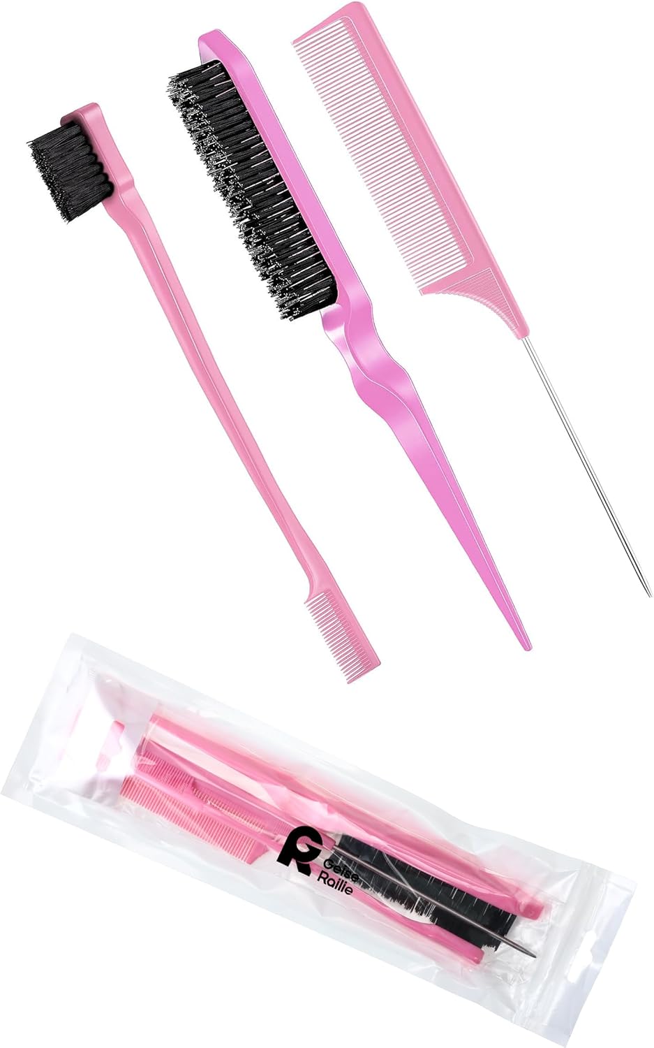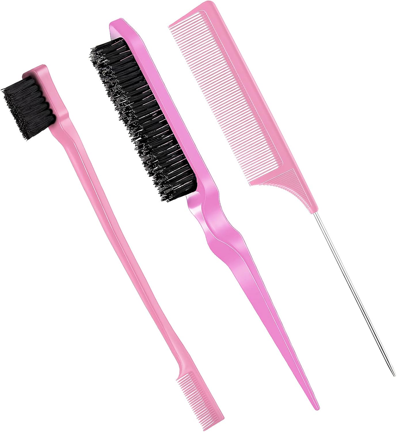 Geiserailie 3 pcs slick back hair brush set bristle hair brush edge control brush teasing comb rat tail comb for women baby kids’ black hair (pink), Geiserailie-fddrf03