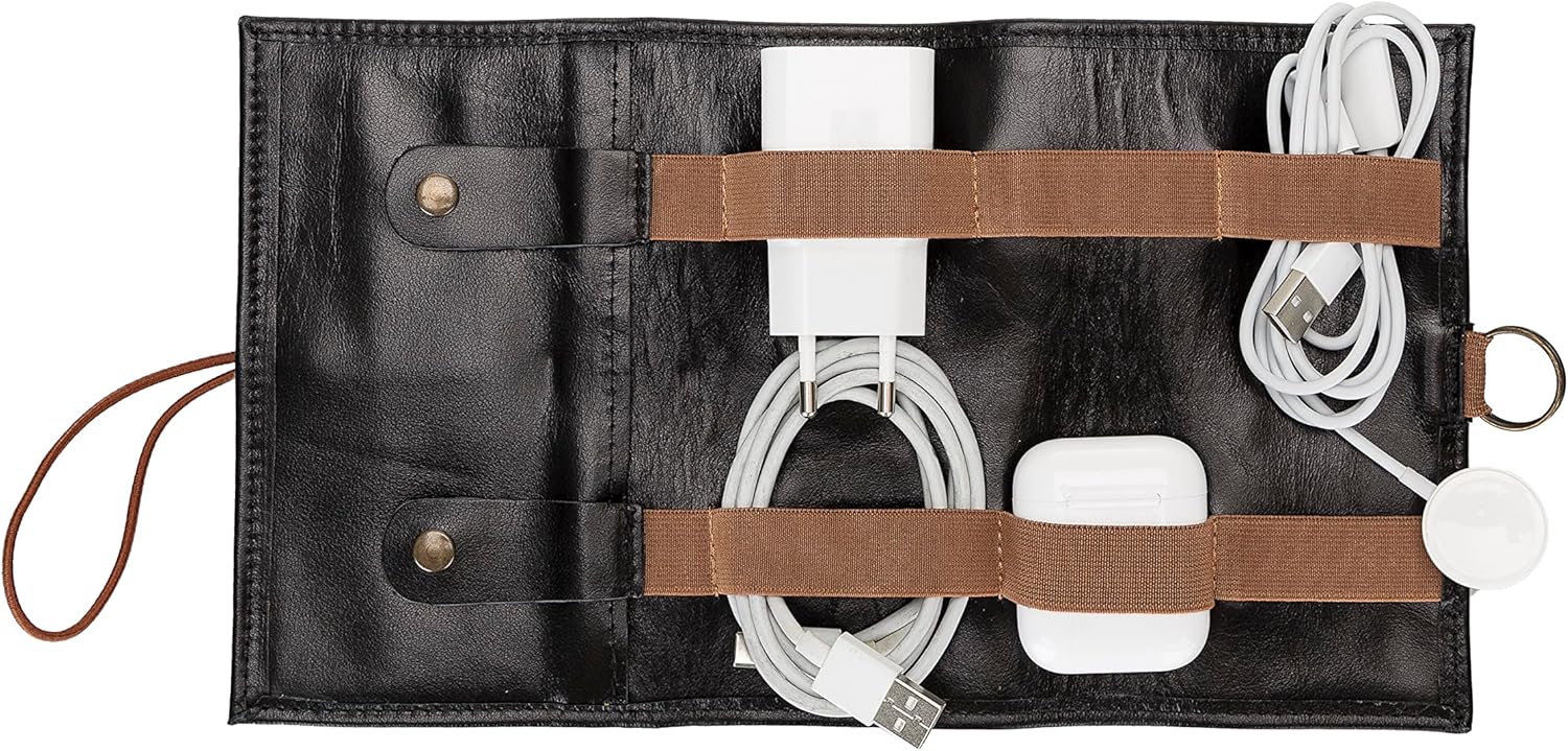 Genuine Leather Cable Organizer, Leather Electronic Accessories Cable Roll Organizer, Waterproof, Gadget Organizer Case, Travel Essentials Bags Organizer, Handmade for Men and Women (RST1)