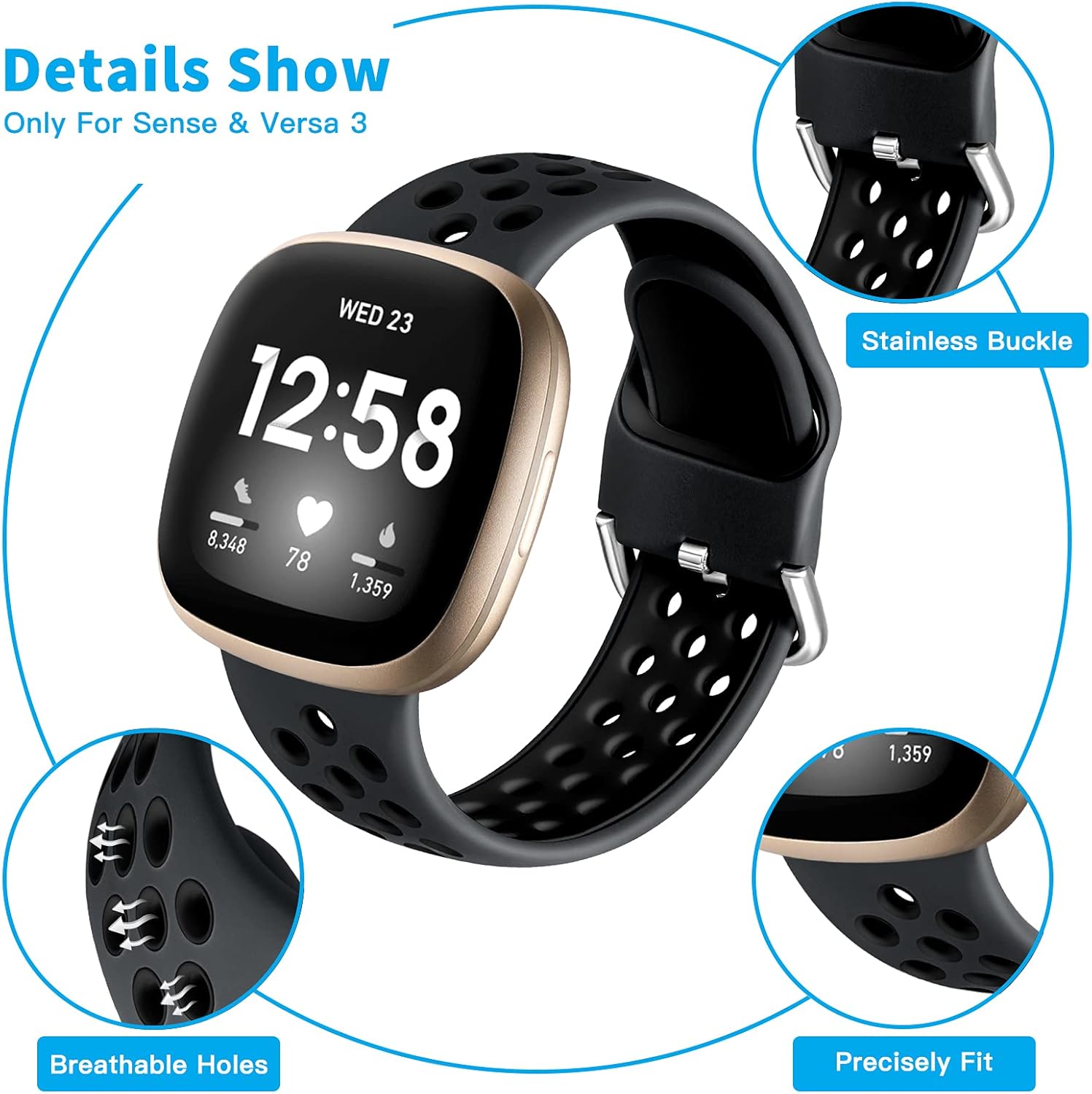 Getino Compatible with Fitbit Versa 3 Bands Fitbit Sense Bands Women Men, Breathable Duarable Replacement Sport Silicone Wristbands Accessories Strap with Air Holes Large Small