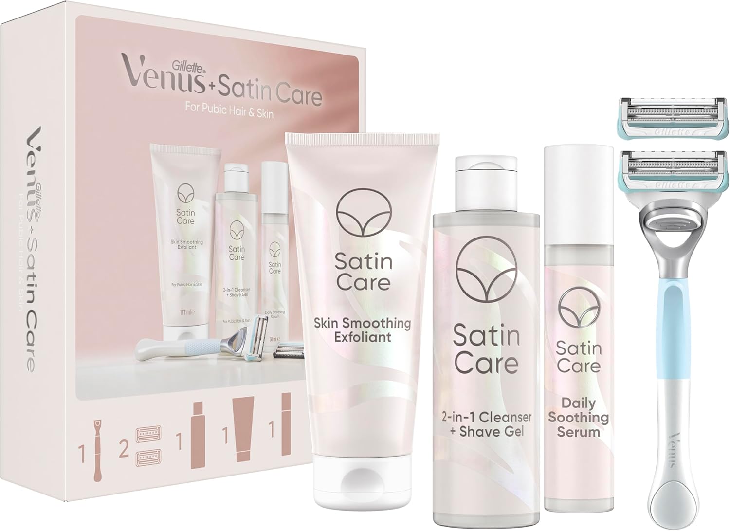 Gillette Venus + Satin Care for Intimate Areas Razor Women and Gift Set, Women’s Razor Intimate Area + 2 Razor Blades, Exfoliation, 2-in-1 Cleaning and Shaving Gel, Serum, Cosmetic Bag
