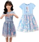 Girls Princess Sequin Dress, Round Neck, Elsa Print, A-Line Pleated, Ages 4-13 Years, Summer Party Dress,Children’s Lisa dress