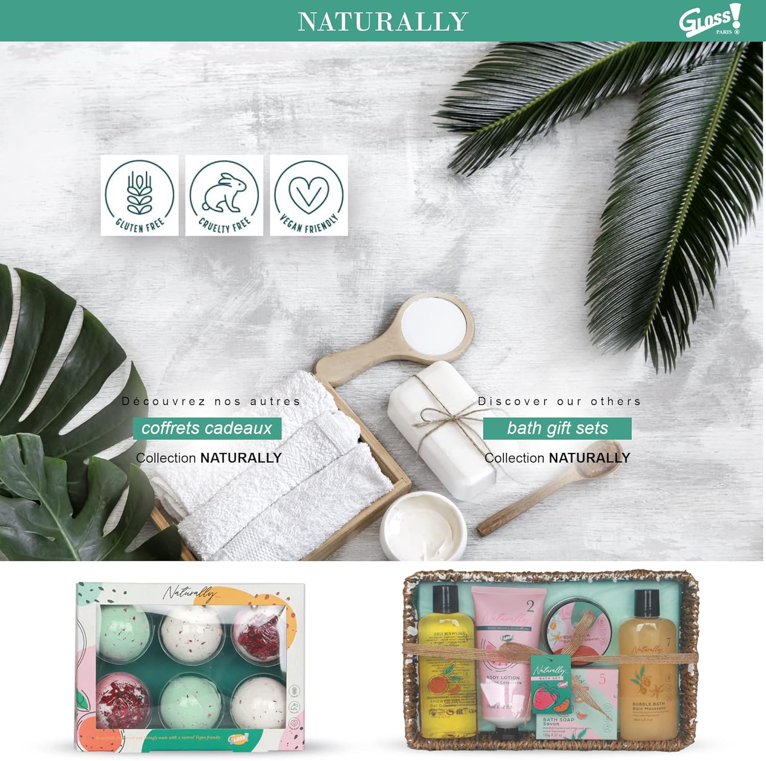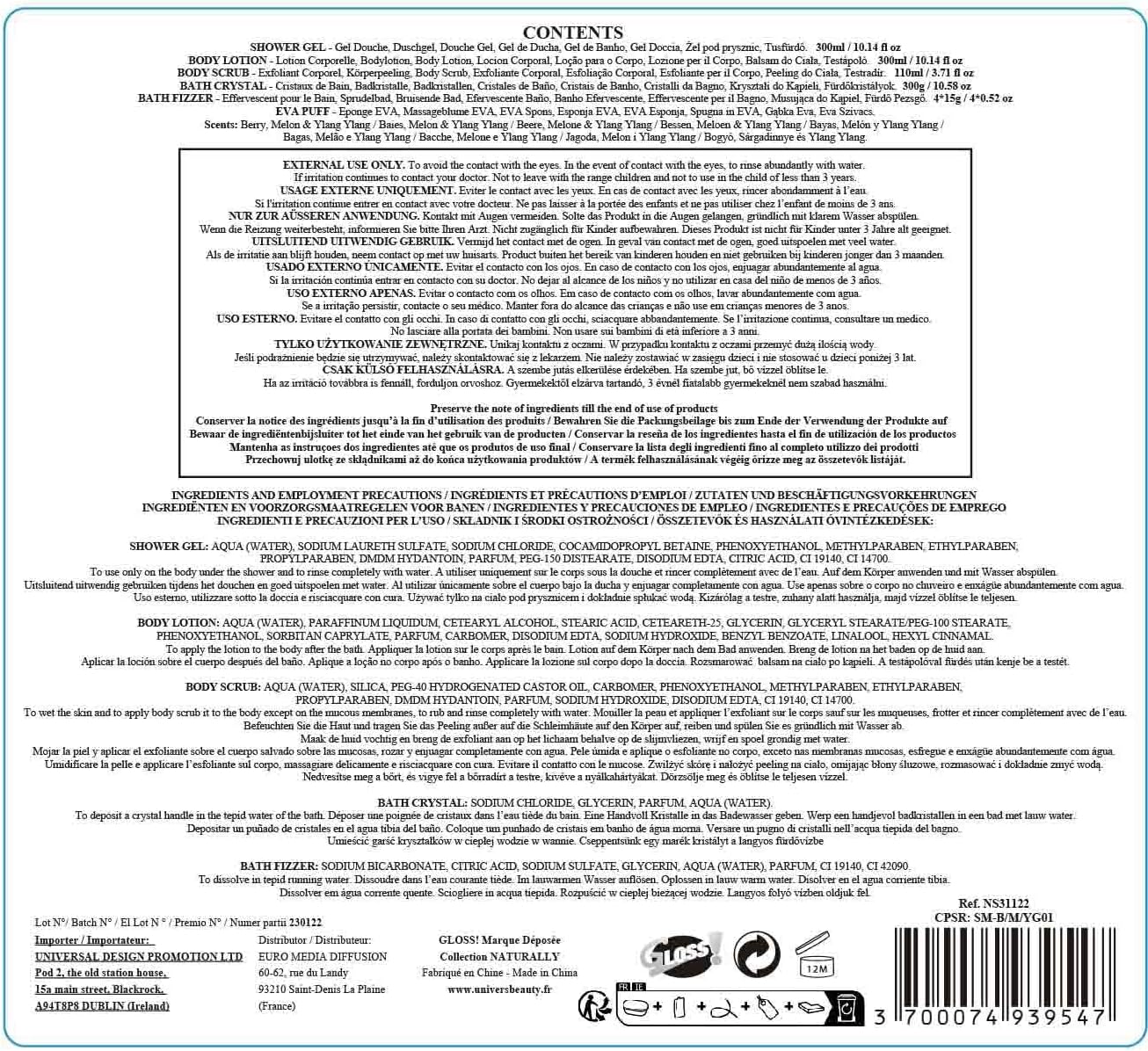 Let yourself be tempted by this box with fruity, exquisite and delicious notes from the Naturally collection. Discover our beauty box from the Naturally BY GLOSS collection! with the scent of Berries, Melon & Ylang Ylang. This box is an ideal gift for any occasion. Its recipient will be amazed by its content, designer design, originality and elegance. The purity of Berries, Melon & Ylang Ylang brings power to the pleasure of bathing and SPA. More than products, offer moments of relaxation, carefree and well-being. The box is totally reusable for storing beauty accessories in the bathroom. A 2 in 1 gift is a wonderful gift that makes double pleasure. Perfect as a birthday gift for your loved ones, Valentine’s Day, Mother’s Day, Christmas gifts, fun gifts. Contents of the bath set: 1 shower gel 300 ml, 1 bath crystals of 300 g, 1 body lotion 300 ml, 1 body scrub 110 ml 4 x 15 g effervescent ball, 1 EVA sponge