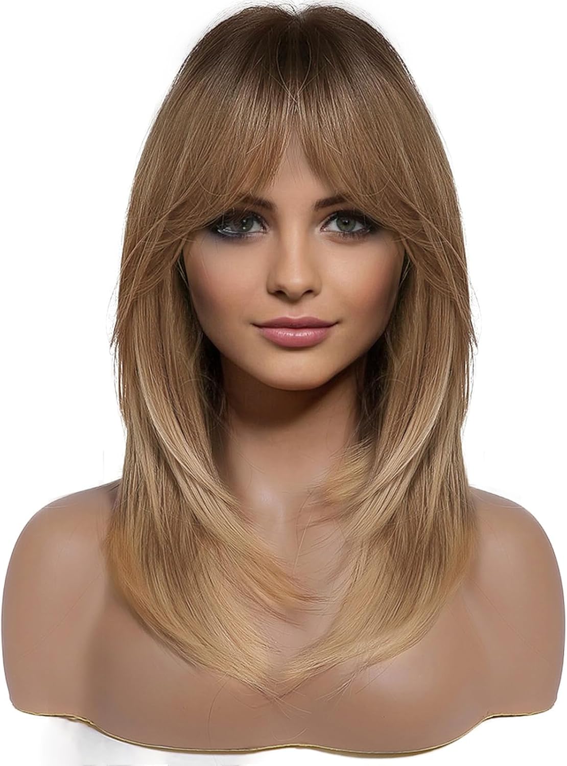 HAIRCUBE Long Layered Wigs for Women Synthetic Hair Wig with Bangs Ombre Brown to Blonde with Dark Roots