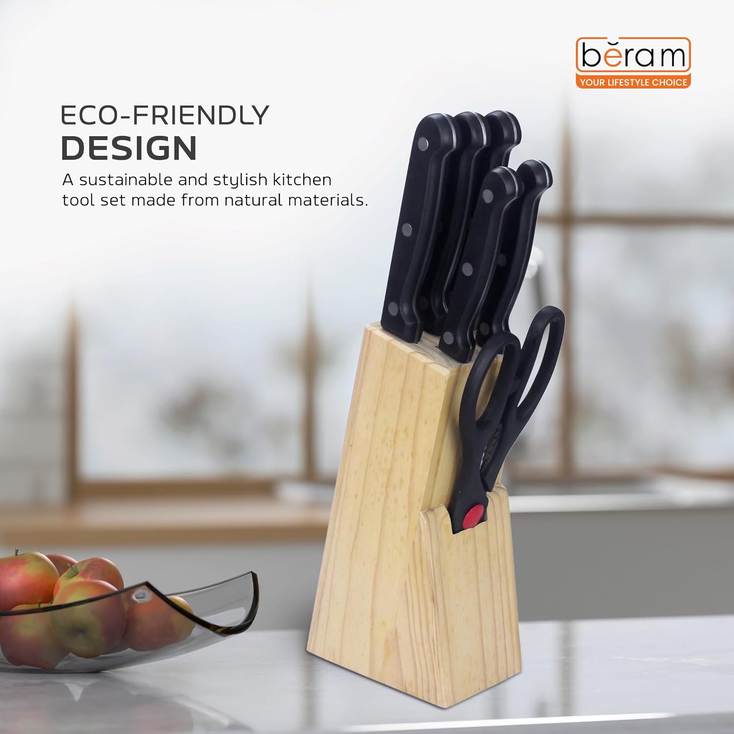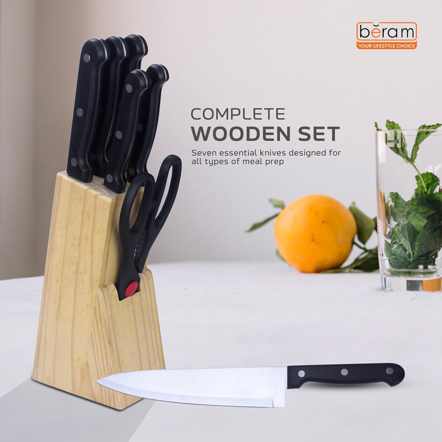 Haus Roland 7 Pieces Wooden Block Knife Set, Kitchen Set with Multipurpose Scissors, Sharp Knives for Cutting, Chopping, Slicing, Mincing and Dicing