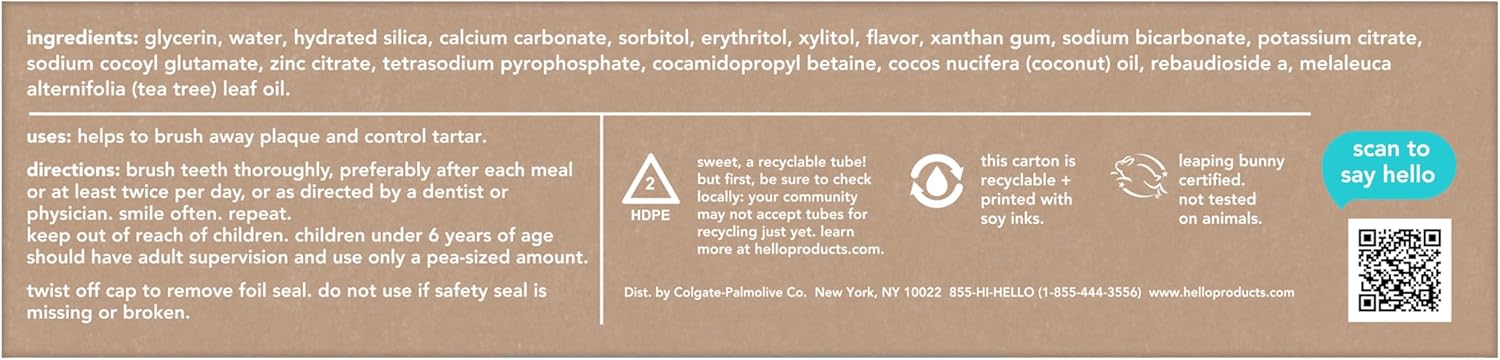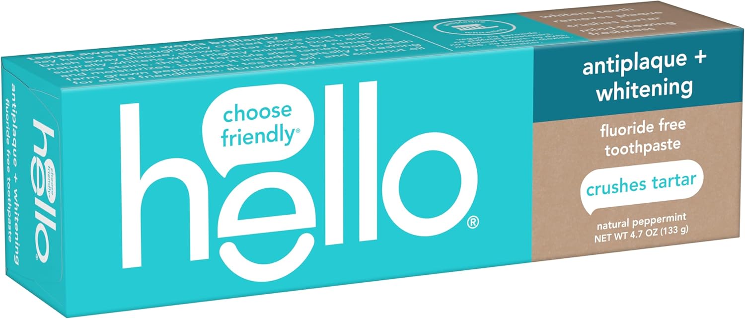 Say hello to a friendly fluoride free toothpaste that helps whiten teeth and crush tartar with hello Antiplaque Fluoride Free Whitening Toothpaste. This fluoride free toothpaste is thoughtfully formulated with high quality ingredients like farm grown peppermint, tea tree oil, and coconut oil to help tame bad breath. Add a bit of friendly freshness to your brushing routine with this peppermint toothpaste from hello. This hello whitening toothpaste helps brush away plaque, shows tartar who’s boss, and naturally whitens with mighty minerals by removing surface stains. Plus, the fab formula moisturizes so you can start your day with minty fresh breath and smile brighter. This hello fluoride free toothpaste doubles as a vegan toothpaste and a SLS free toothpaste and contains no peroxide, no artificial sweeteners, no artificial flavors, no dyes, no titanium dioxide, and no SLS. No-brainer. As if that weren’t enough magic for one tube, hello toothpaste is also not tested on animals (Leaping Bunny Certified). We’re serious about being friendly, and about what goes into our paste.