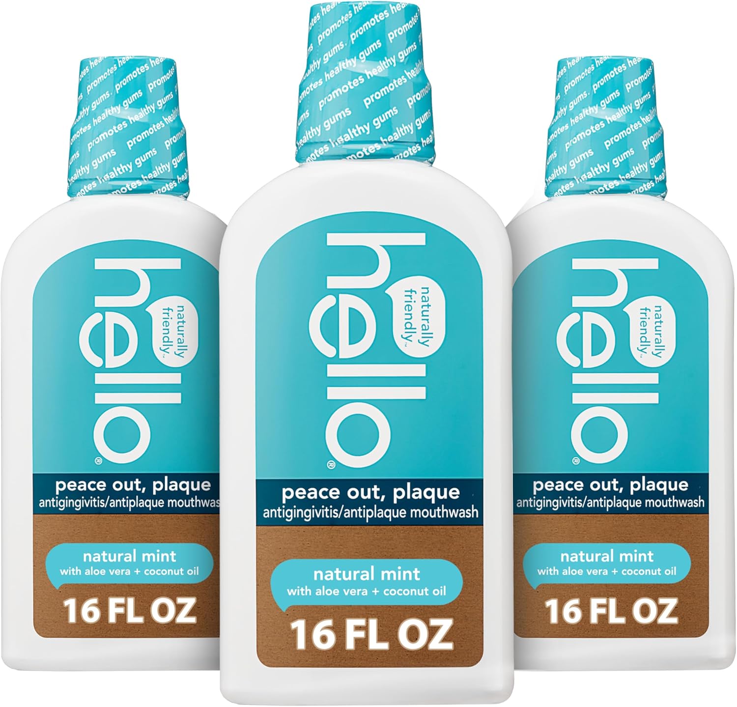 Say hello to hello Peace Out Plaque Alcohol Free Mouthwash* an unbelievably fresh and minty fluoride free mouthwash that freshens like crazy. This thoughtfully crafted non-alcoholic and fluoride free mouthwash pack kicks bad breath straight to the curb and uses a combination of natural mint and a touch of coconut oil and aloe vera. With every swish, this mint mouthwash obliterates bad breath and leaves your mouth feeling minty fresh all day long. Hello Peace Out Plaque Fresh Breath Mouthwash is an antiplaque, antigingivitis mouthwash that promotes healthy gums by fighting plaque. It’s the no-brainer choice for anyone looking to choose friendly for their mouth. When it comes to freshening up and fighting back on plaque, choose this 3 pack of hello Peace Out Plaque Mint Mouthwash. hello Peace Out Plaque Fluoride Free Mouthwash is vegan and made with no artificial flavors or artificial sweeteners, no dyes, no parabens, no gluten, no SLS, and no fluoride, making this hello mouthwash a no-brainer. Plus, this non-alcoholic fresh breath mouthwash is not tested on animals (Leaping Bunny Certified) and helps promote healthy gums and moisturizes magnificently. Give plaque the boot, and promote healthy gums with a freshness that lasts using hello Peace Out Plaque Mint Fluoride Free Mouthwash. *this formula does not contain ethyl alcohol