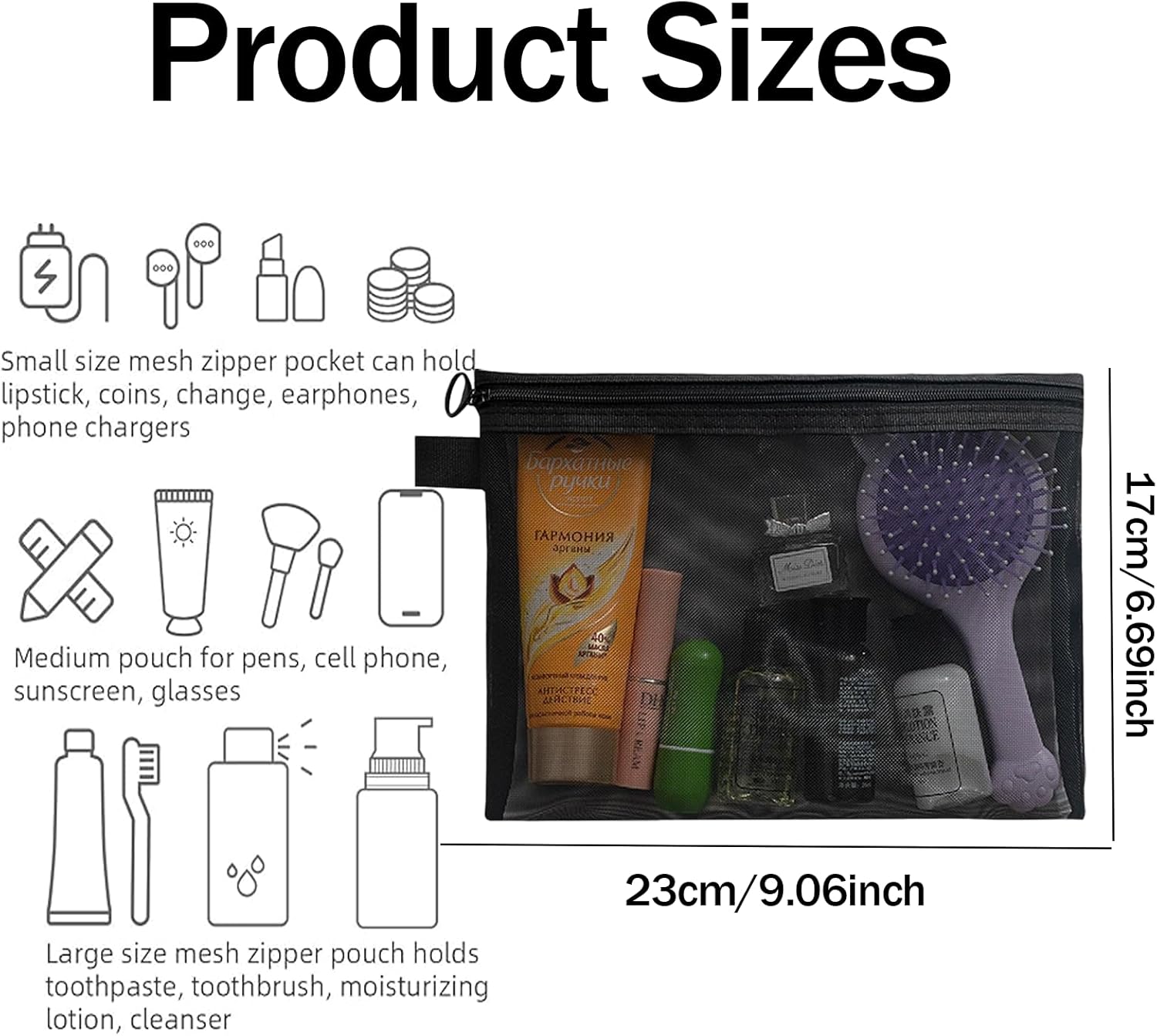Complete Set:This set of mesh makeup bags includes 6 zipper bags, each measuring 9.06 x 6.69 inches. Great for organization and storage, these mesh makeup bags are suitable for storing your beauty essentials, toiletries, and other tems