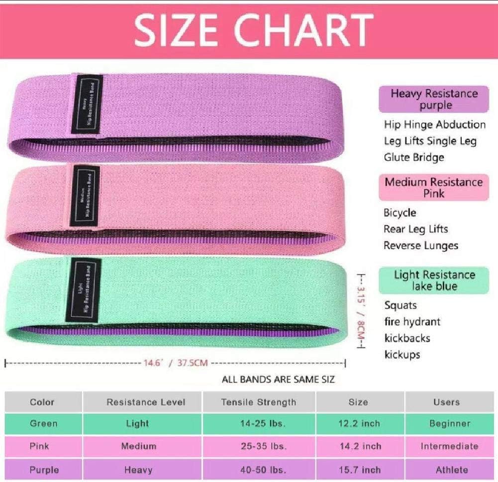 ✔️THREE DIFFERENT RESISTANCES: The booty band comes in the 3 resistance levels designed with 3 different colors: Green-Light (15~25lbs), Pink-Medium (25~35lbs), Purple – Heavy (35~50lbs). It is fit for all fitness level so that you could easily tailor your training depending on your strength, ability and comfort no matter you are a beginner, advanced user.