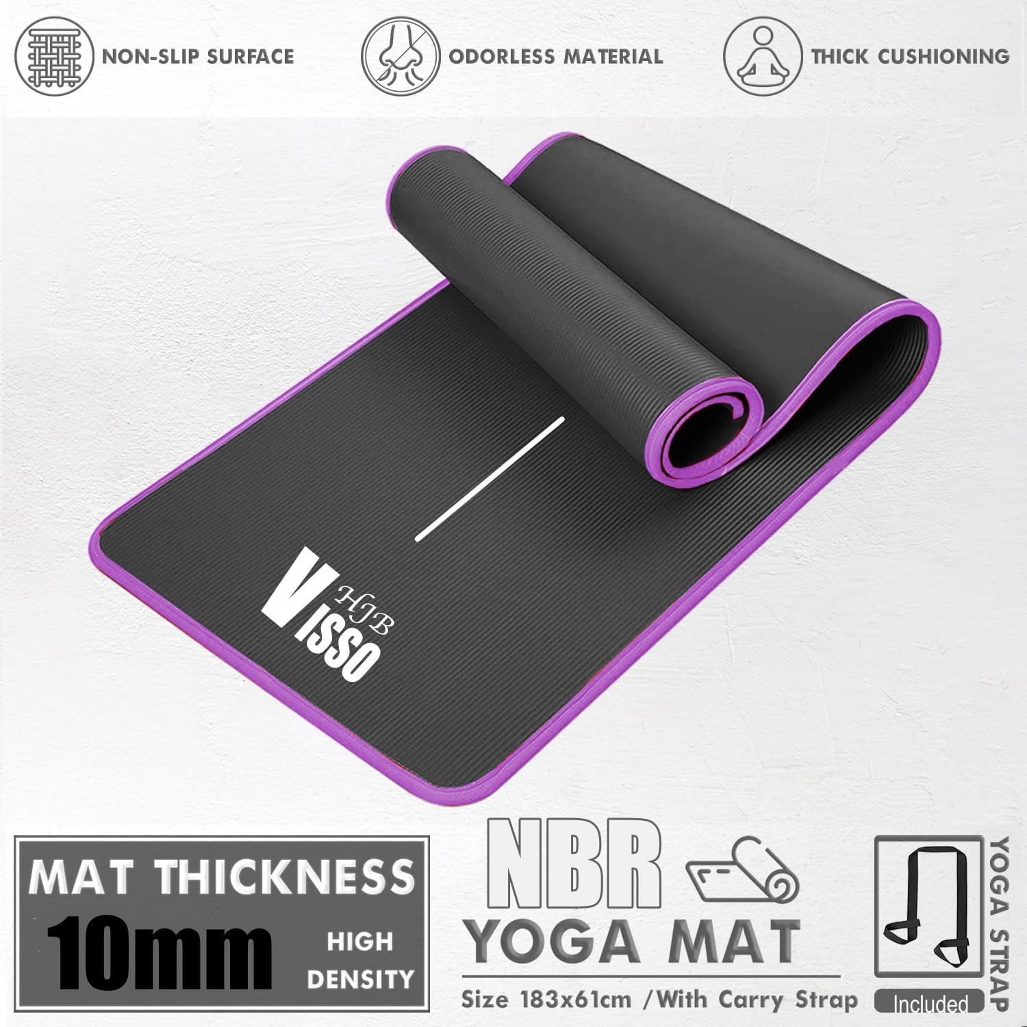 HJB VISSO Yoga Mat Non-Slip, 10mm Thick Exercise Mat with Carry Strap for Men & Women, High Density Anti-Tear NBR Pilates Mat for Yoga, Pilates, Home & Fitness, Workouts