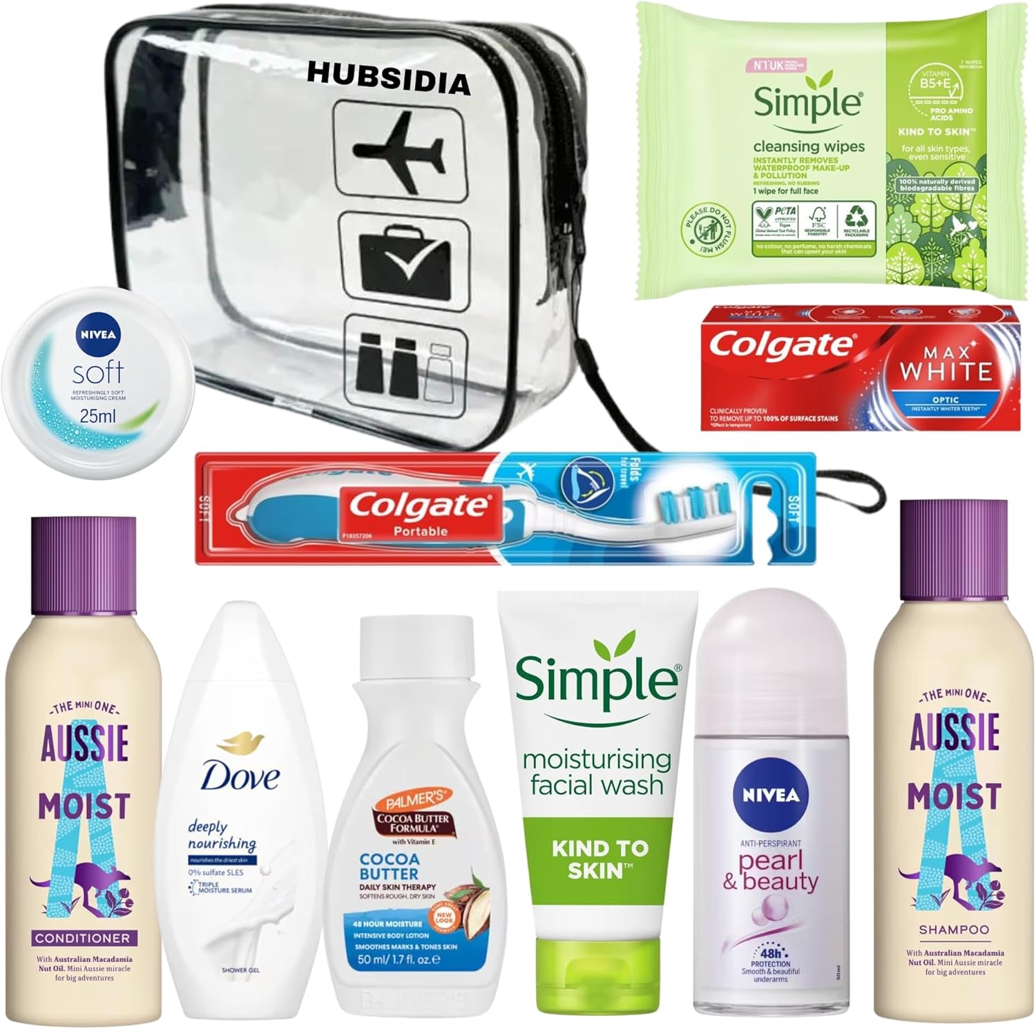 HUBSIDIA Travel Toiletries Set for Women | Mini Toiletries | Travel Size Toiletries Women Kit For Holidays, Vacation, Hospital, Maternity with Airport Security Approved Liquids Bag