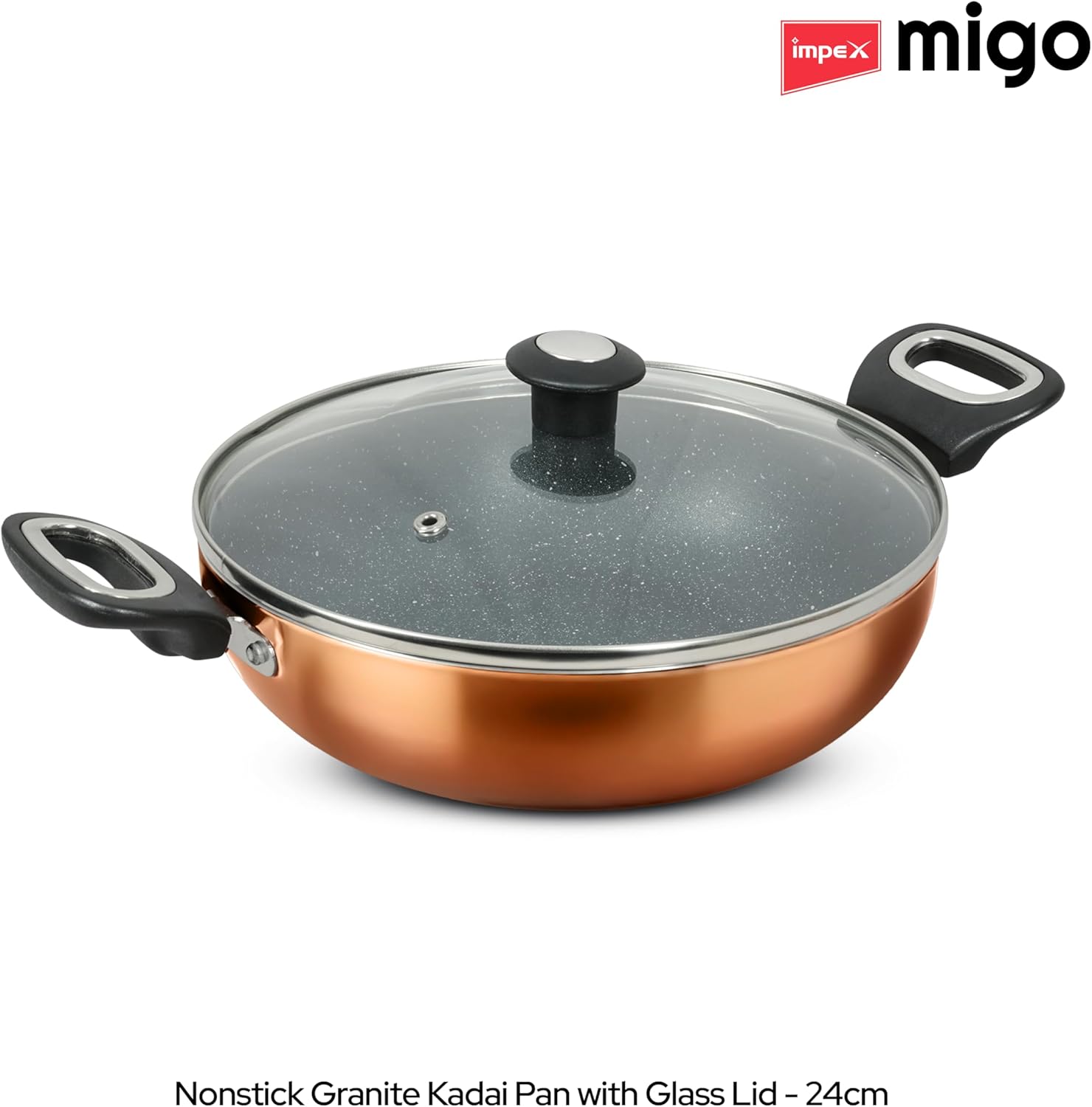 Impex 4-Piece Non-Stick Aluminium Cookware Set | 5-Layer Granite Coating |Heatproof Handles & Anti-Skid Glass Lid| Quick Heating Induction Base | PFOA-Free | Heat Resistant Exterior Paint | FKTCU