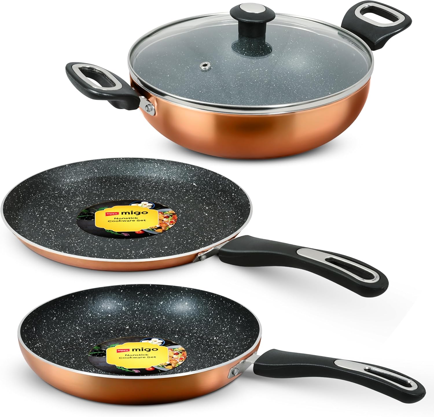 Upgrade your kitchen with this premium 4-piece nonstick cookware set, designed for both style and functionality. Crafted with high-quality aluminum, this set ensures quick and even heating thanks to its induction-compatible base, making it perfect for gas, electric, and induction cooktops. The set includes a 24cm kadai pan, 24cm tawa pan, 24cm fry pan, and a durable 24cm anti-skid glass lid, providing versatility for all your cooking needs. Whether you’re frying, sautéing, or making delicious curries, this super granite-coated cookware offers effortless cooking with minimal oil, ensuring a healthier cooking experience. Engineered for durability, each piece in this Made in India cookware set features a 5-layer super granite coating, providing superior nonstick performance and enhanced scratch resistance. The PFOA-free, eco-friendly coating ensures safe cooking, free from harmful chemicals. The heatproof Bakelite handles offer a comfortable grip and stay cool even during high-temperature cooking, while the heat-resistant exterior paint enhances the set’s longevity and aesthetics. The anti-skid glass lid retains moisture and flavor while allowing you to monitor your dishes effortlessly. This copper-colored cookware set is not just a kitchen essential but also a stylish addition to your home. Whether you’re a professional chef or a home cook, this versatile, easy-to-clean, and highly durable cookware set will make your cooking experience seamless and enjoyable. Backed by a 1-year warranty, you can cook with confidence knowing you’re investing in long-lasting, high-performance cookware. Get your hands on this premium nonstick cookware set today and enjoy hassle-free cooking like never before!