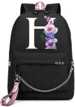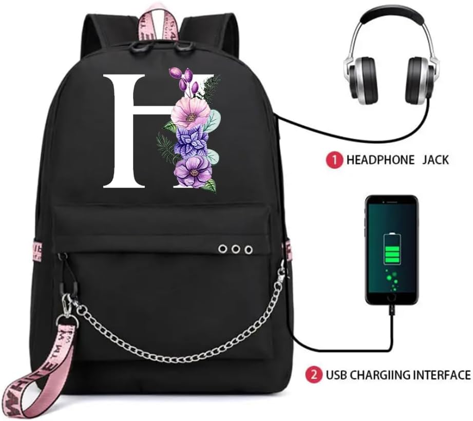 Initial Letter Printed Backpack – Laptop Bag – Casual Shoulder Bag – Travel Companion with USB Charging Port – BLACK