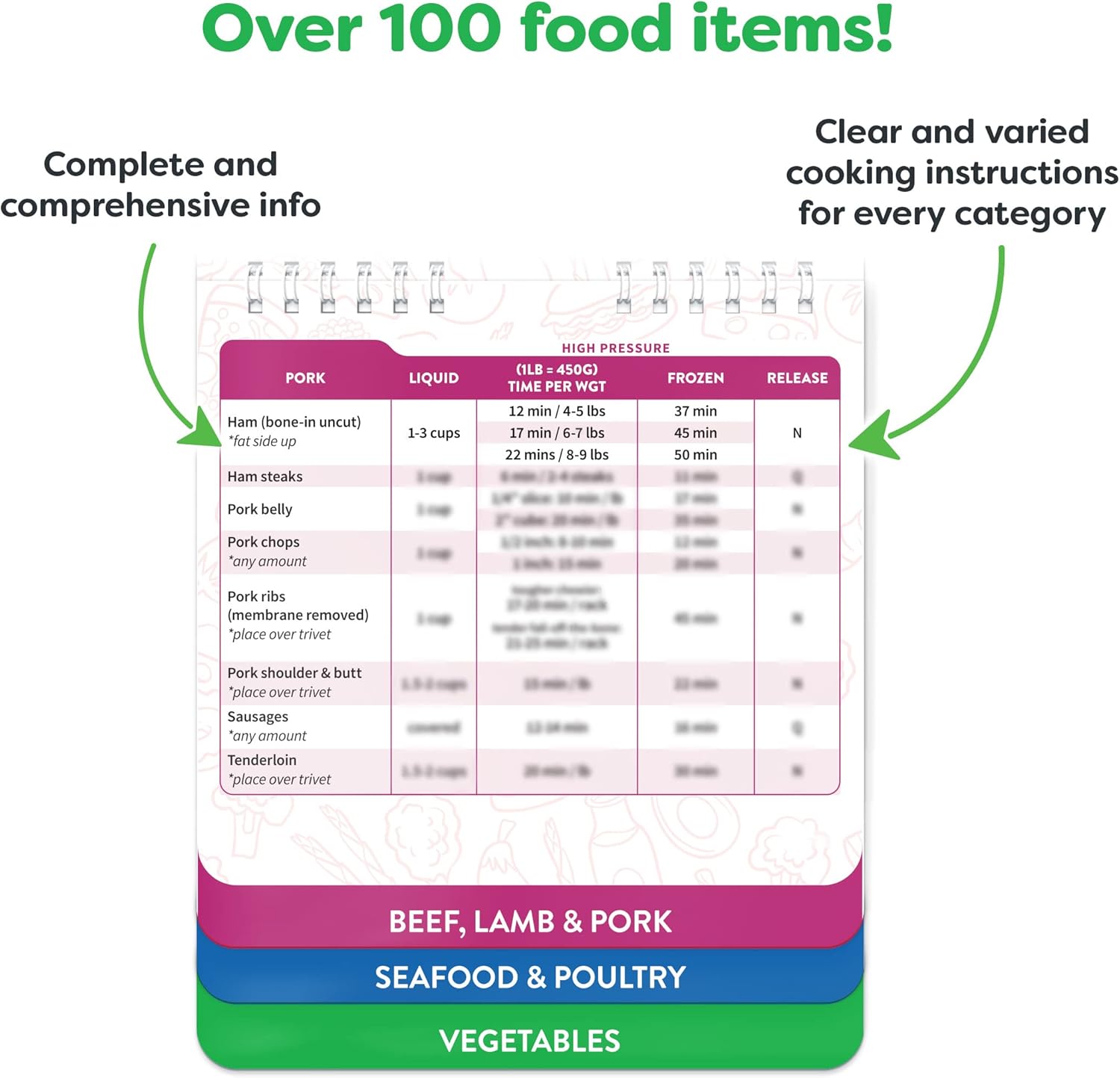 Master Your Instant Pot with Must-Have Instant Pot Accessories. Featuring a magnetic instant pot cooking cheat sheet booklet loaded with over 100 food entries. This pressure cooker accessory is organized into 6 food categories with precise cooking times, pressure levels, and tips. Designed for all instant pot pressure cooker models, it’s a must-have kitchen tool for home cooks seeking speed, accuracy, and flavor.