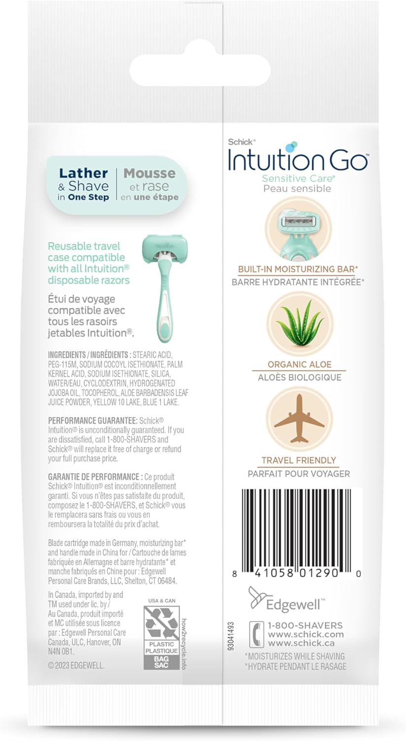Disposable razor convenience meets Schick Intuition’s innovative skin-moisturizing shave! No need for shave gel or refills. With a built-in moisturizing bar made with a touch of organic aloe, Intuition® Go Sensitive Care 1ct Disposable Razor lets you lather and shave in one easy step! Lightweight and convenient with a travel case compatible with all Intuition Disposable razors, Intuition Go is a must-have among your travel essentials, ensuring you’re always ready for life’s spontaneous moments. Intuition’s smooth-gliding 4-blade sensitive skin razor hugs the contours of your legs and body for a close, smooth shave.